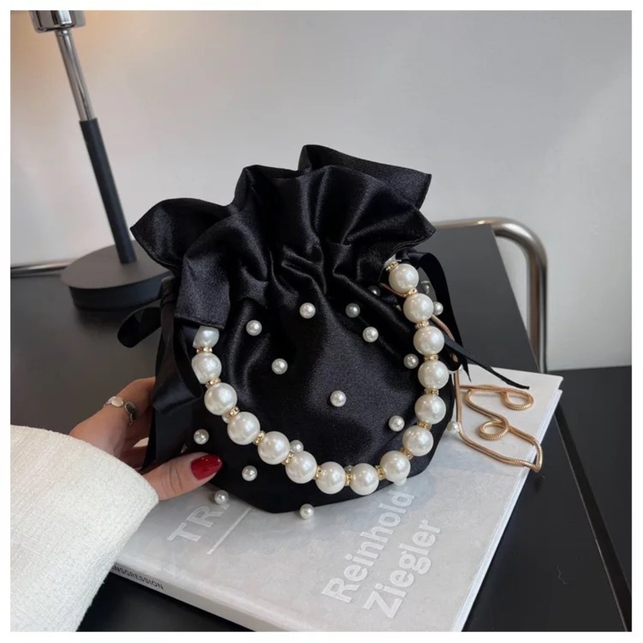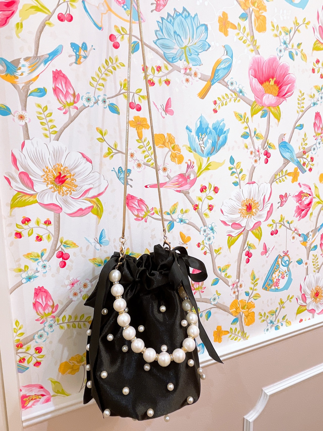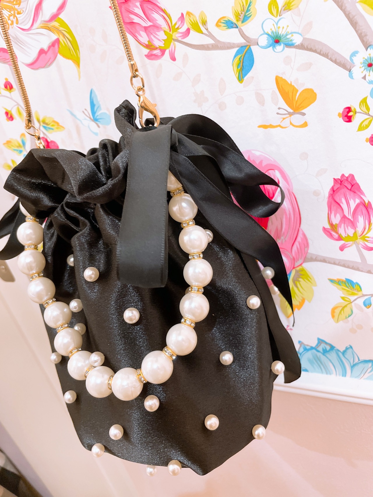 ドットパールにパールのハンドルが華やかなバッグ。