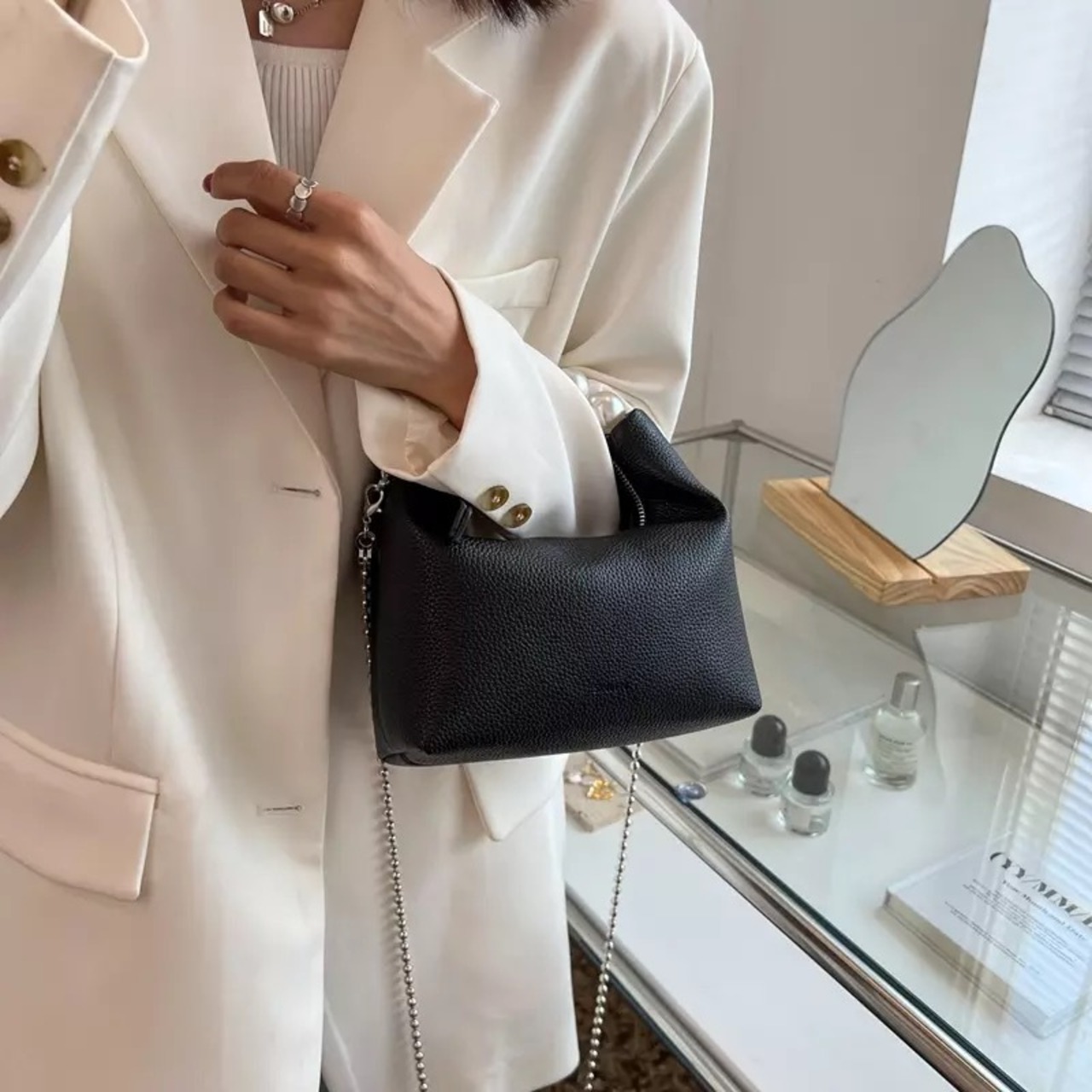 シンプルなスタイリングのアクセントとしてもオススメなバッグです。