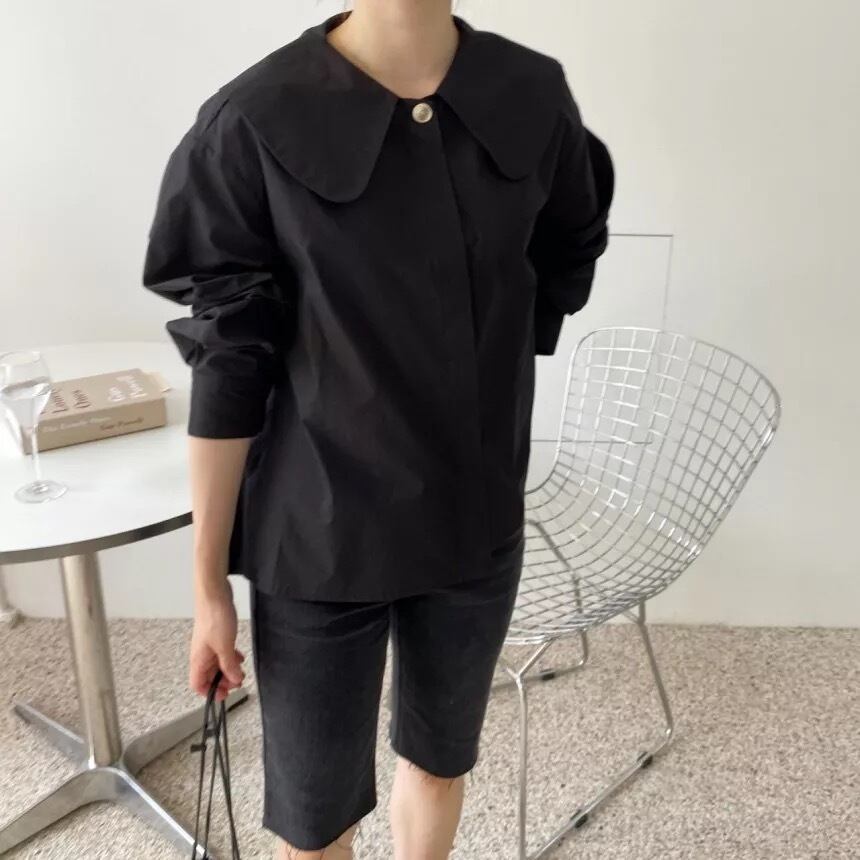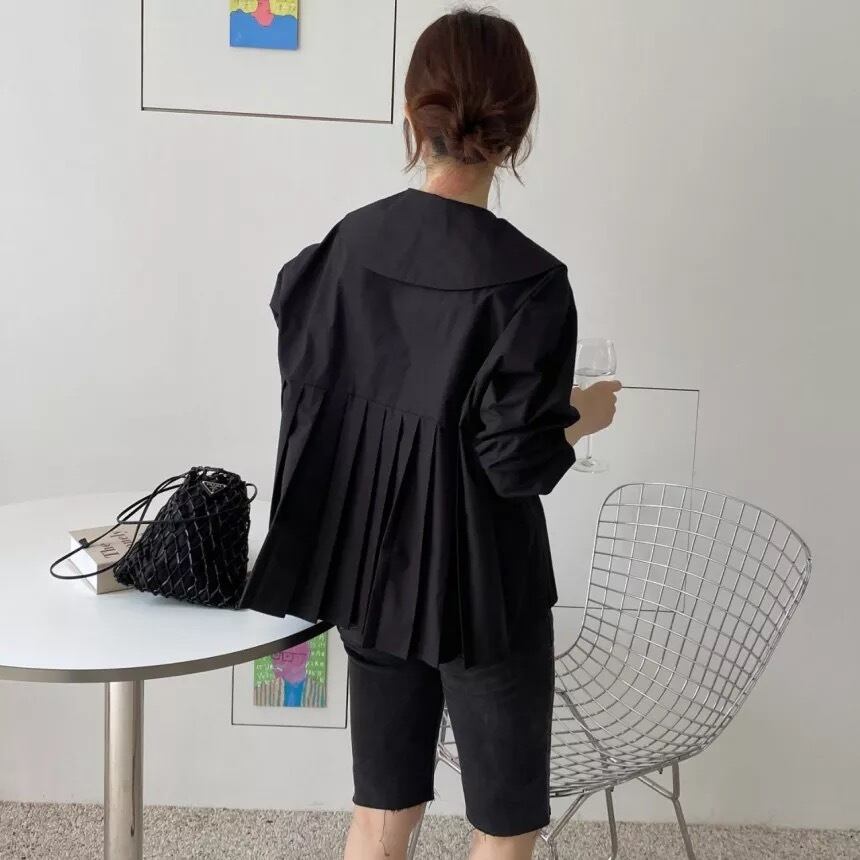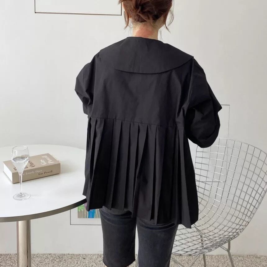 大きめの襟元とバックプリーツにトレンド感あるブラウス。