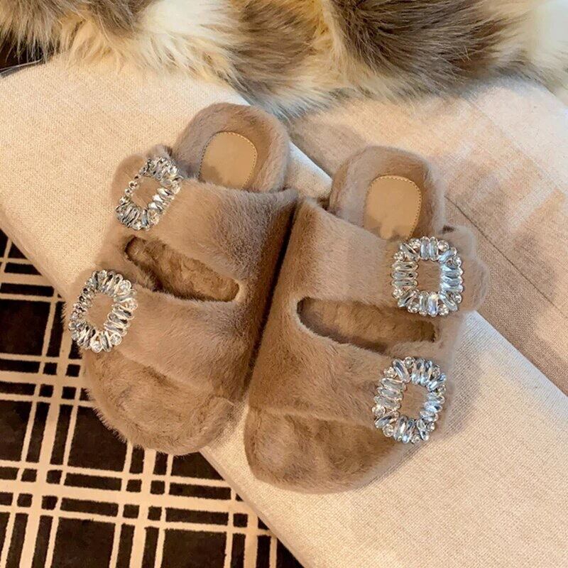 スクエアビジューが華やかなファーサンダル。