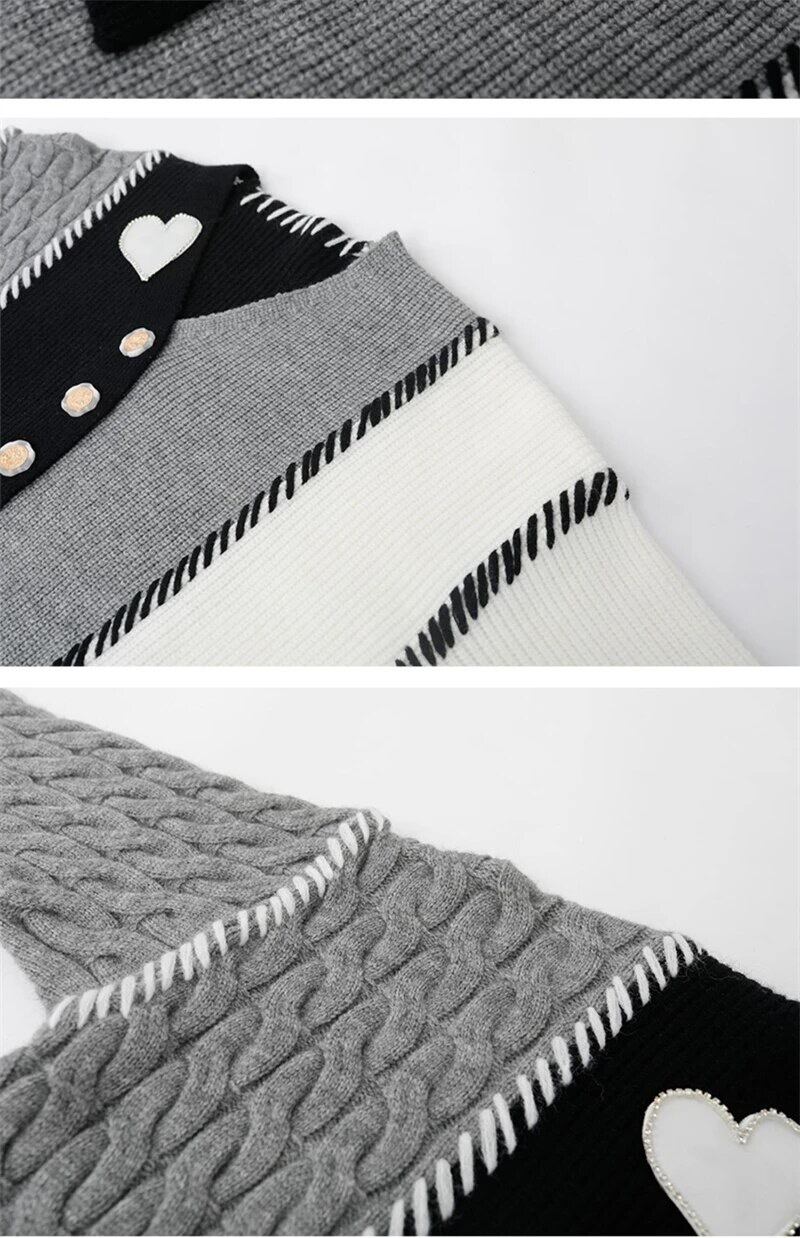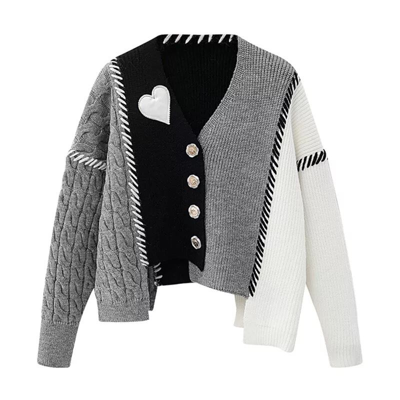 配色デザインにハートやステッチがアクセントのニットカーディガン。