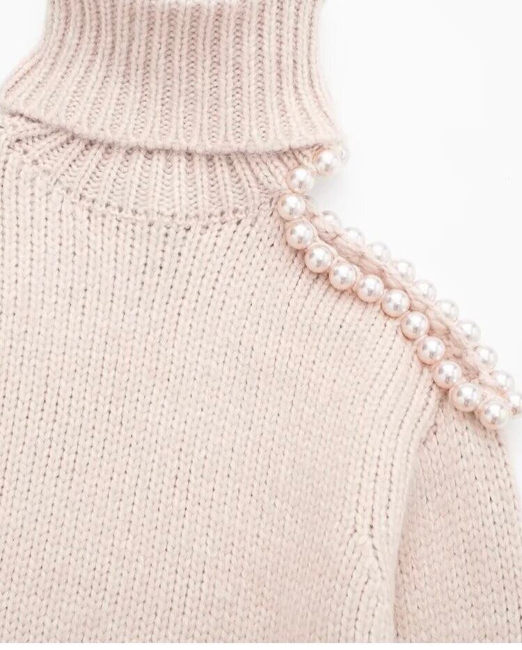 ショルダーパールがアシンメトリーにデザインされたタートルニット。