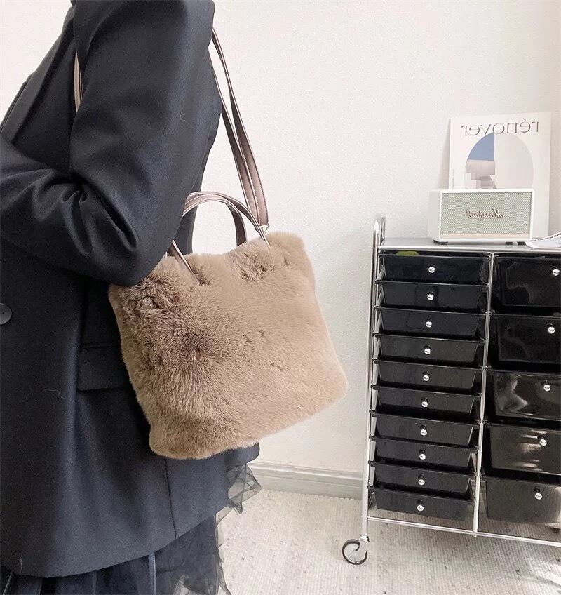 サイドを折り込むと、型を変えて2デザインお楽しみ頂けるファーバッグは、ショルダーにもなり、様々なスタイリングに。
