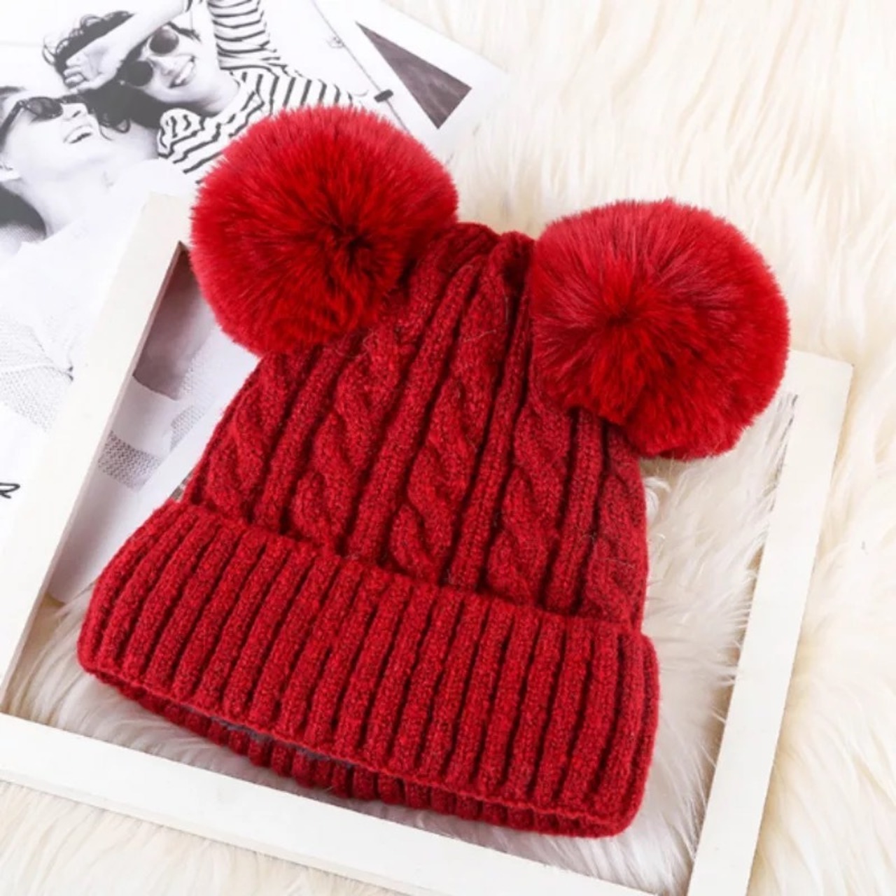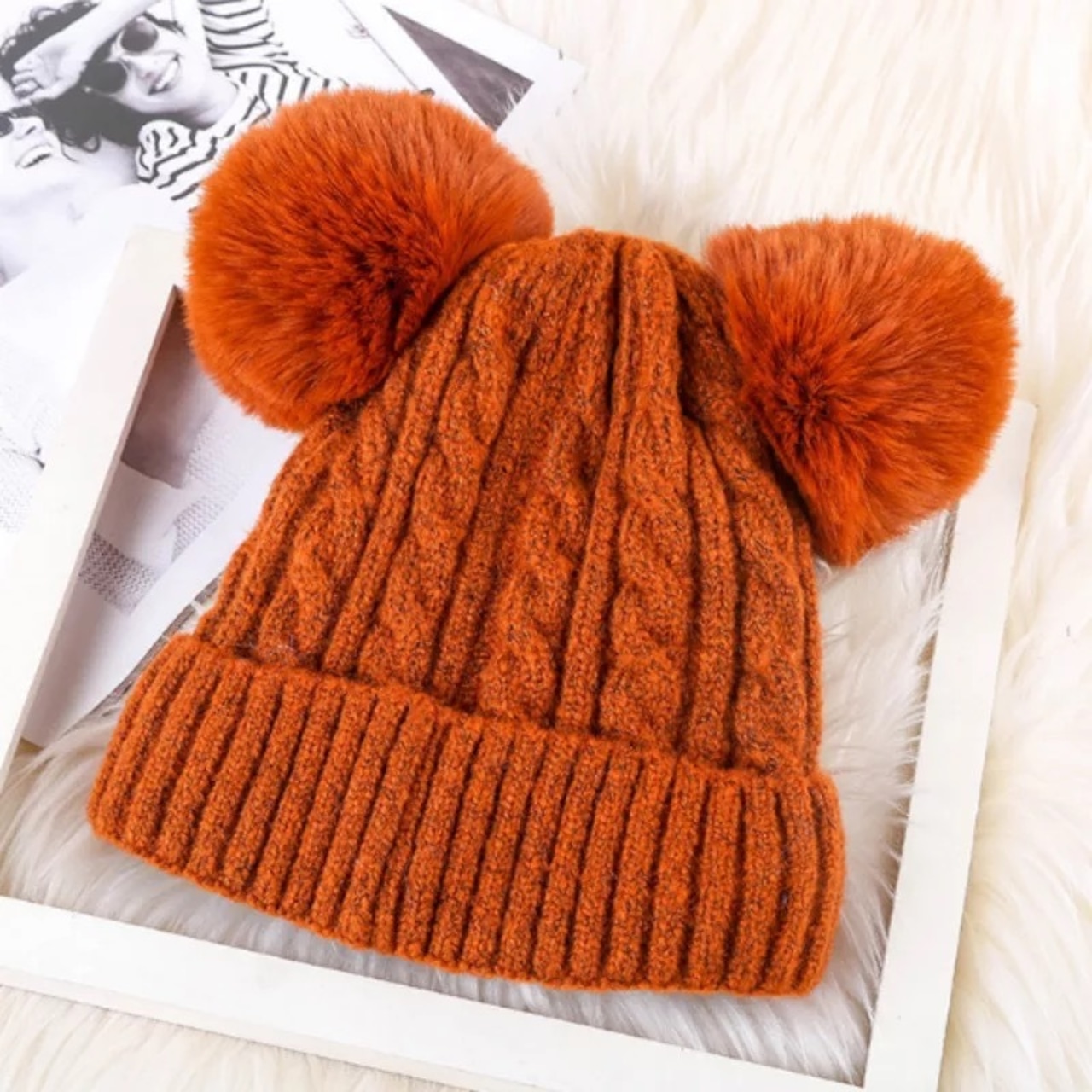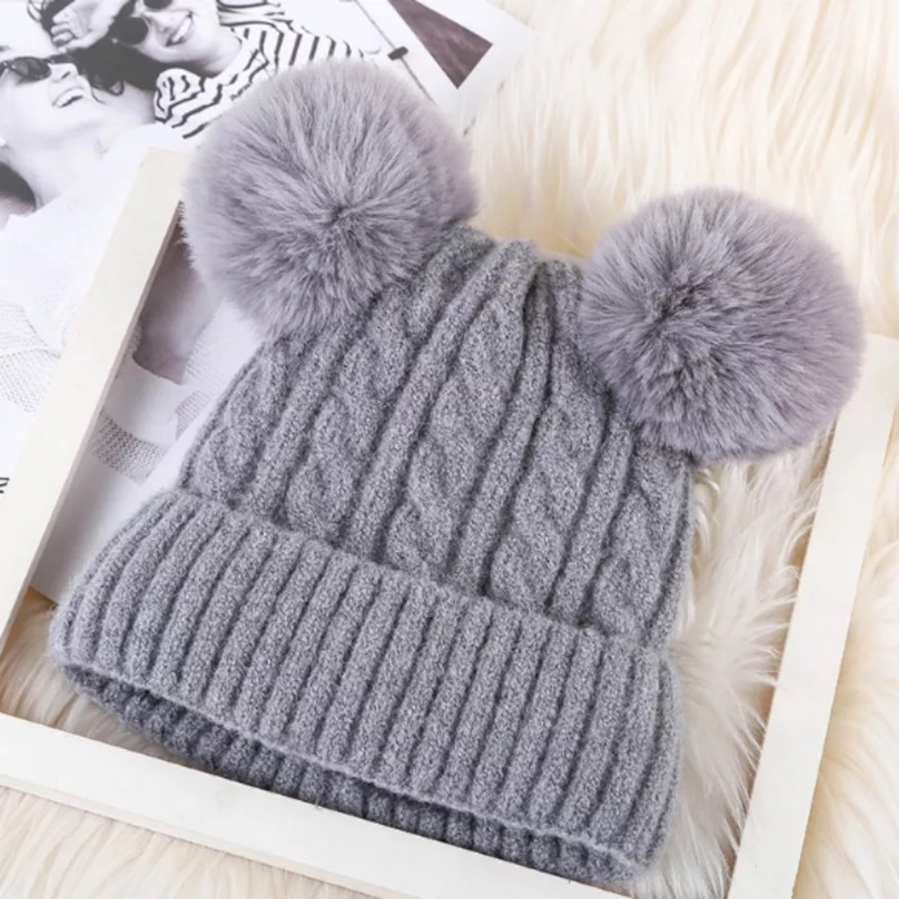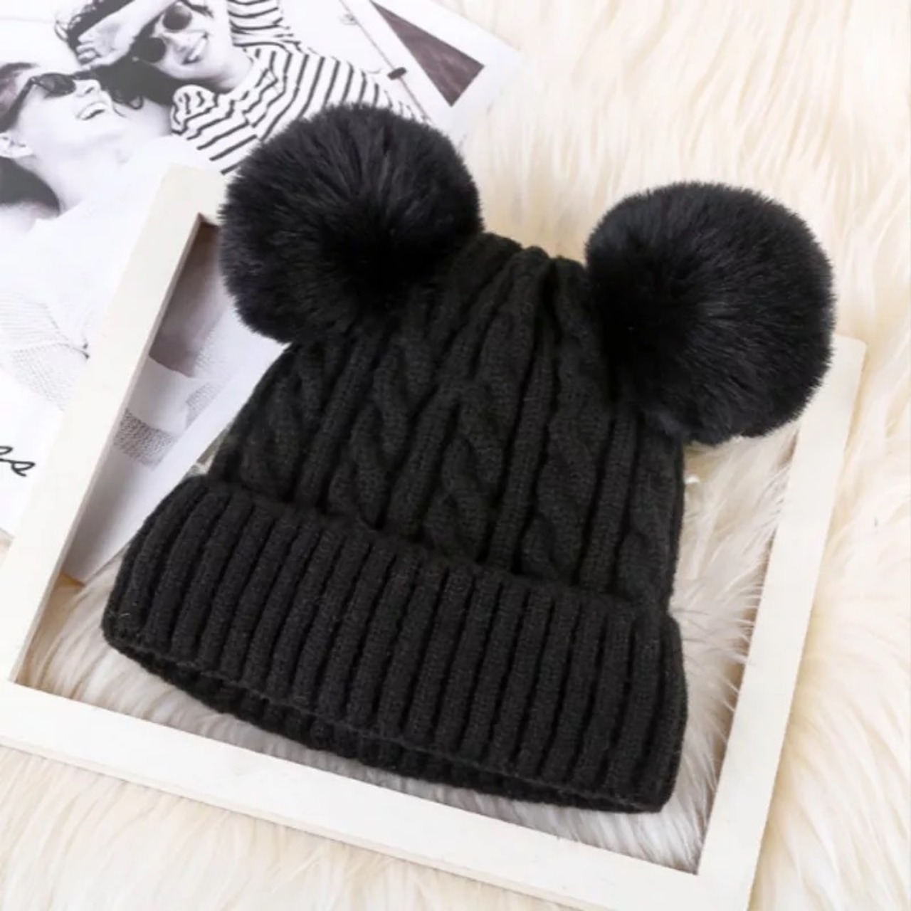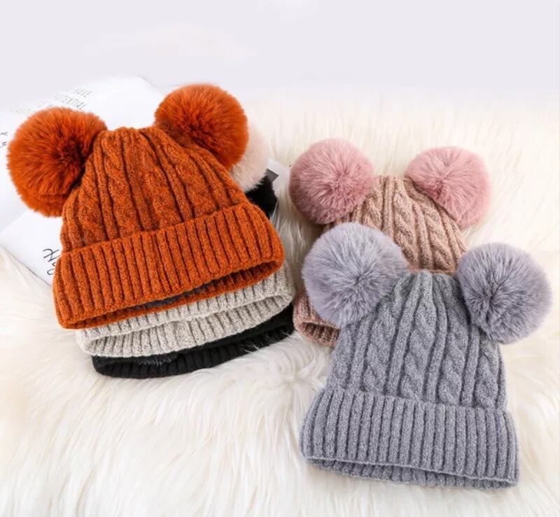 耳のようなデザインが可愛いファーポンポンがデザインされたニット帽。