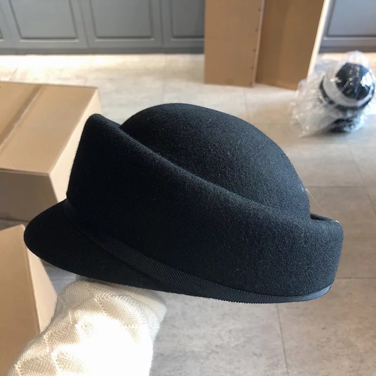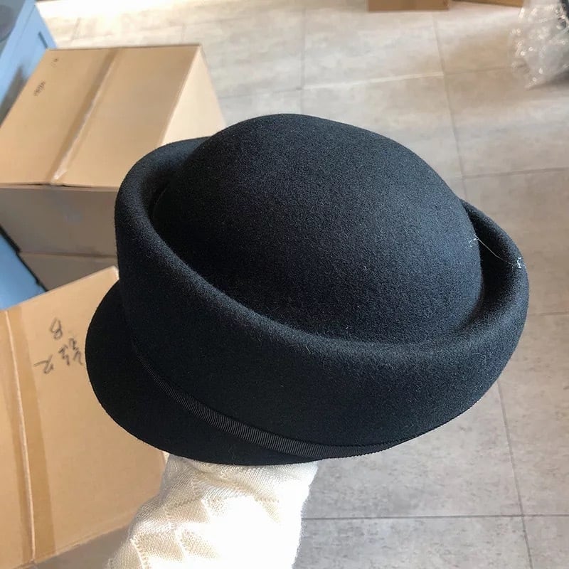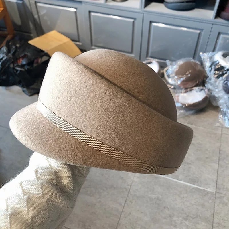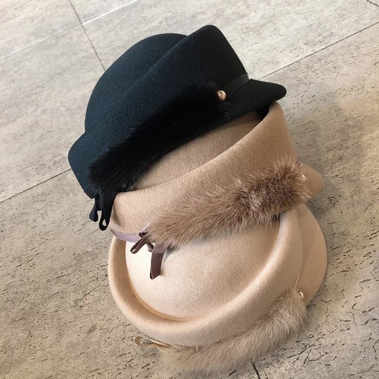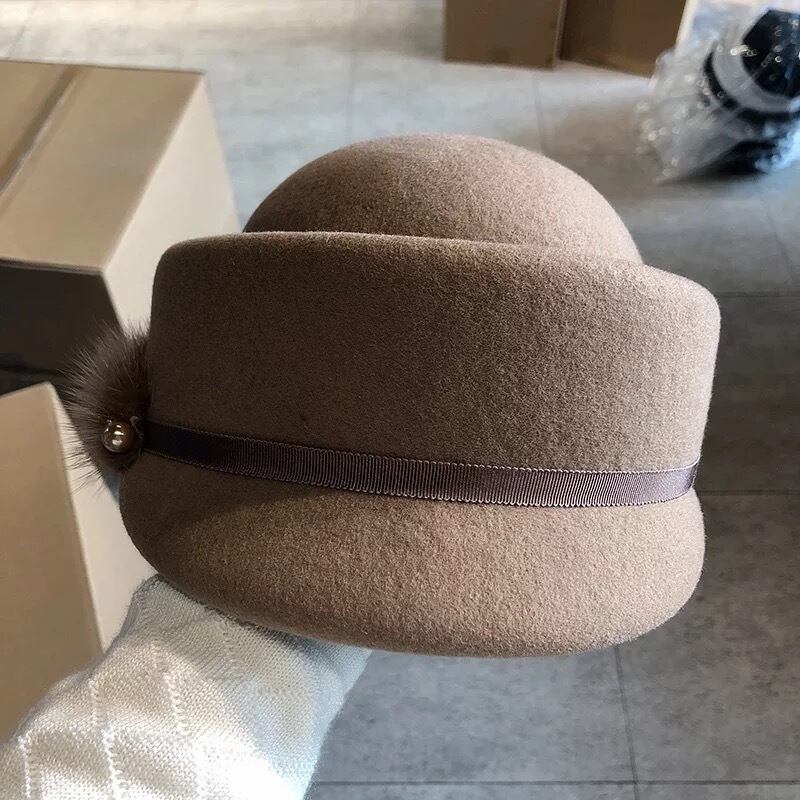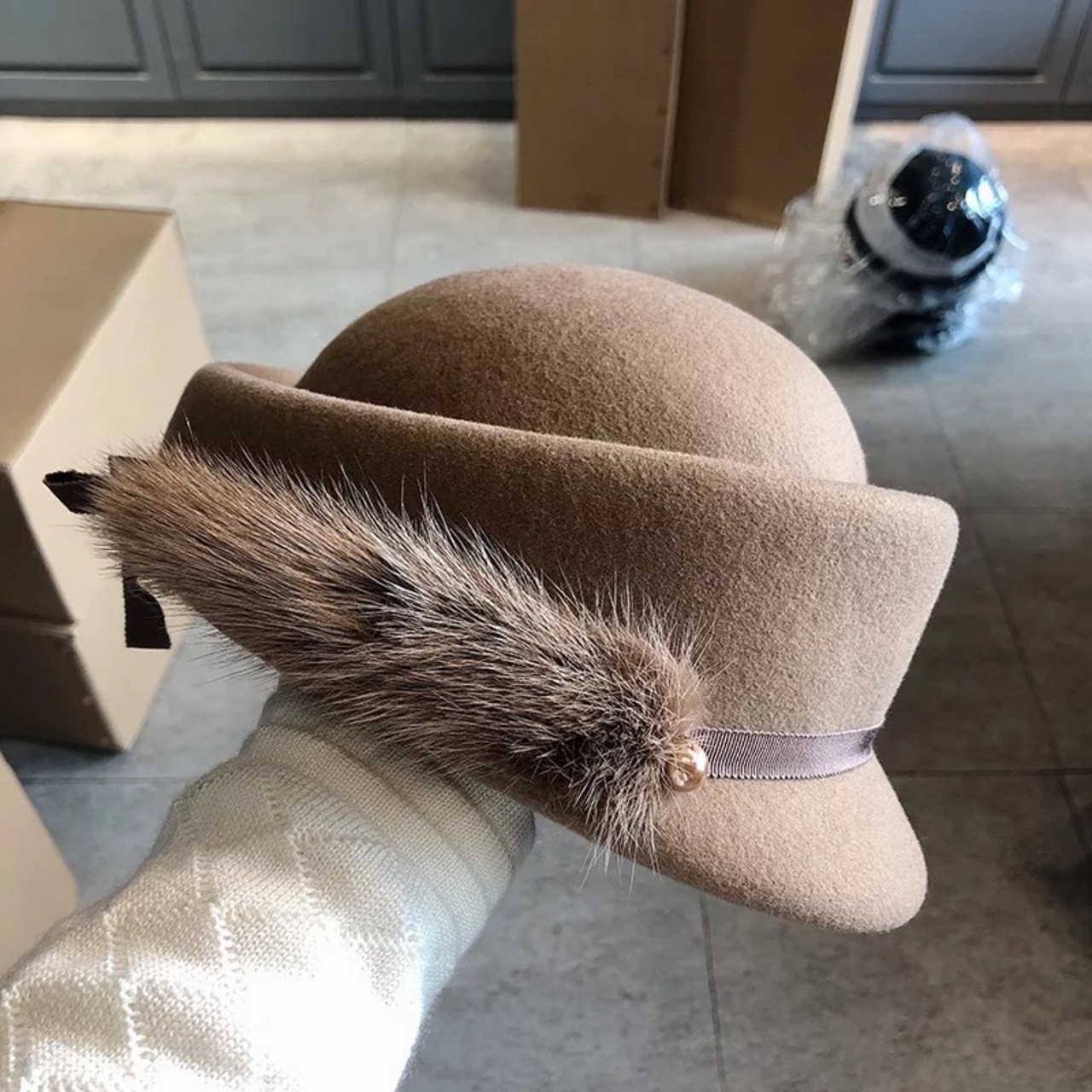 サイドのファーと、グログランリボンがアクセントの帽子。