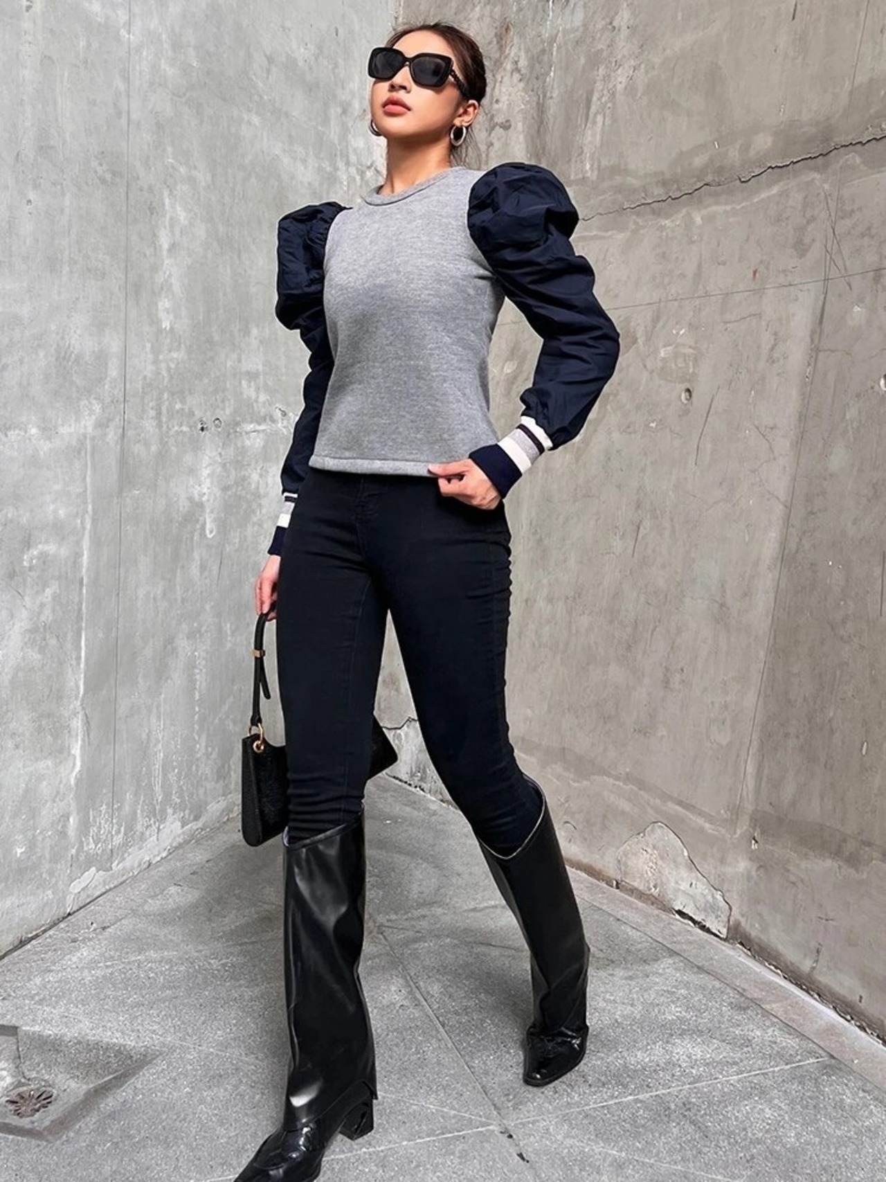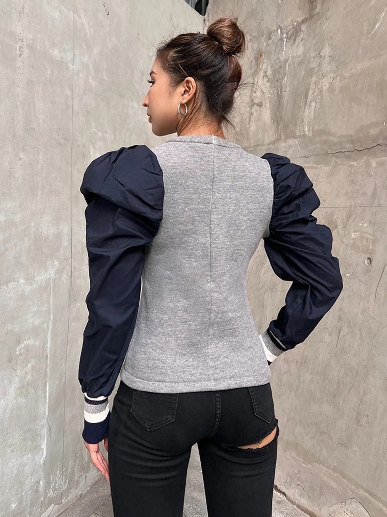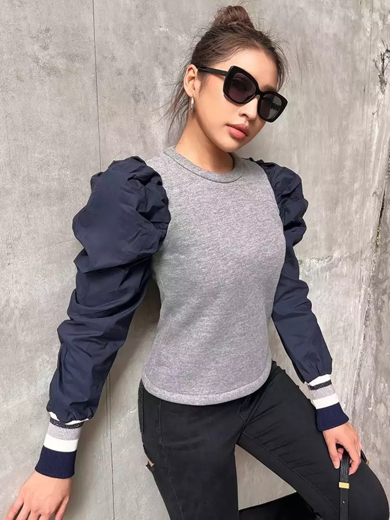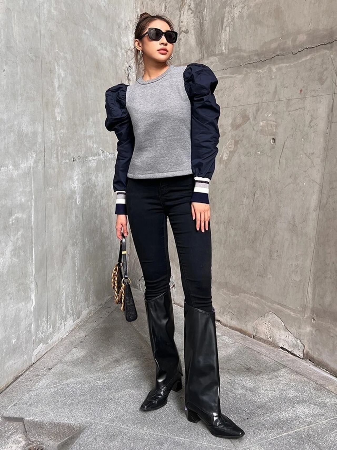 パフショルダーにお袖口にはラインが入ったニットトップス。