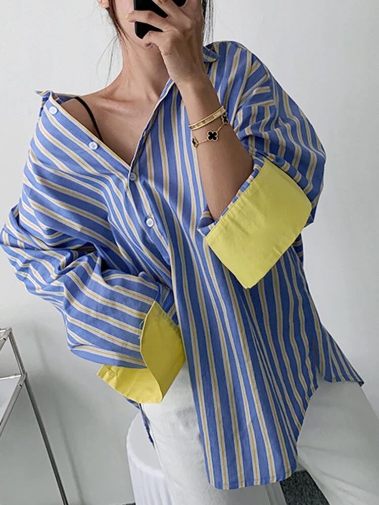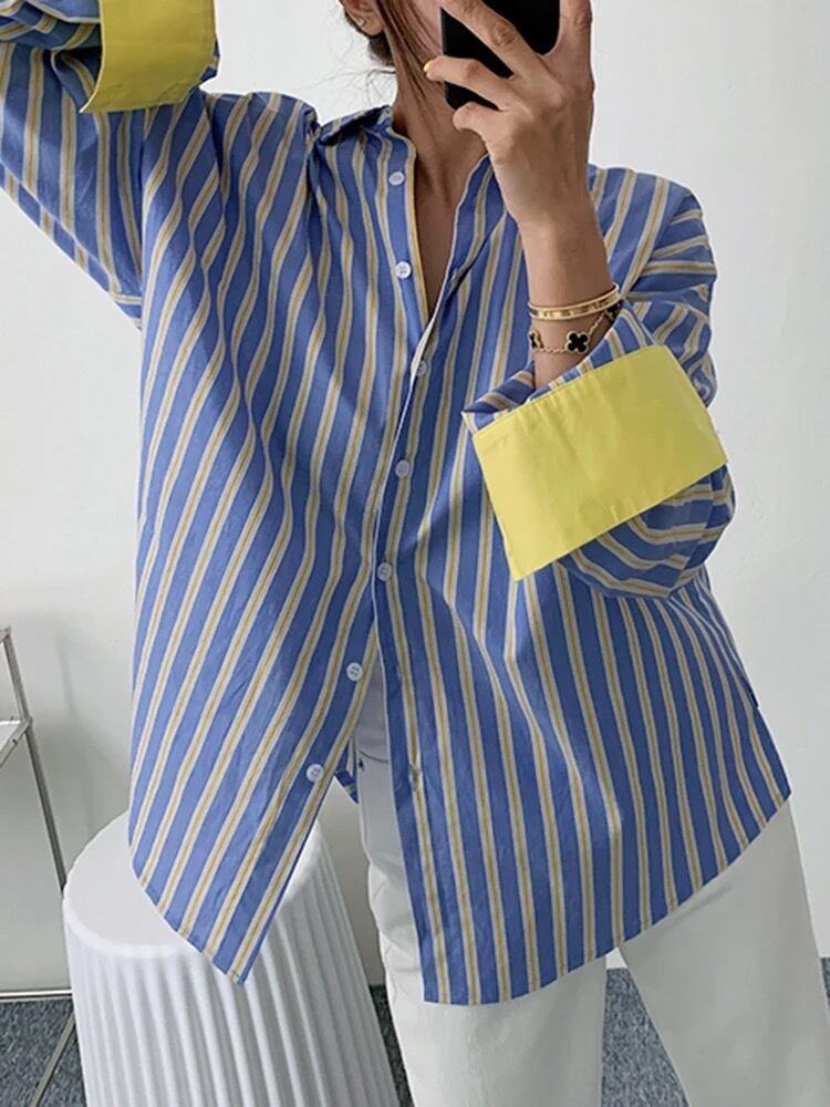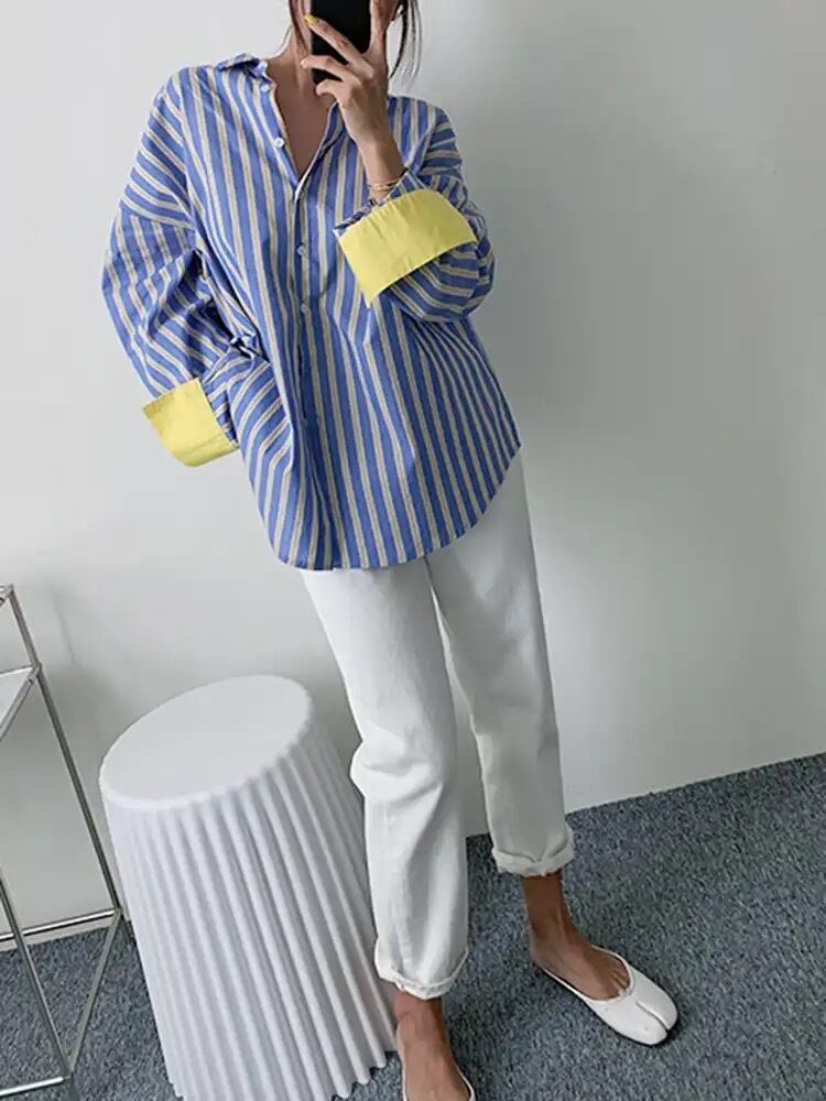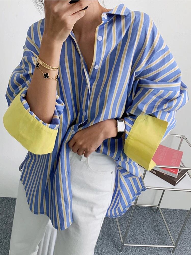 ストライプ柄にお袖の折り返しはイエロー配色がアクセントになったシャツ。