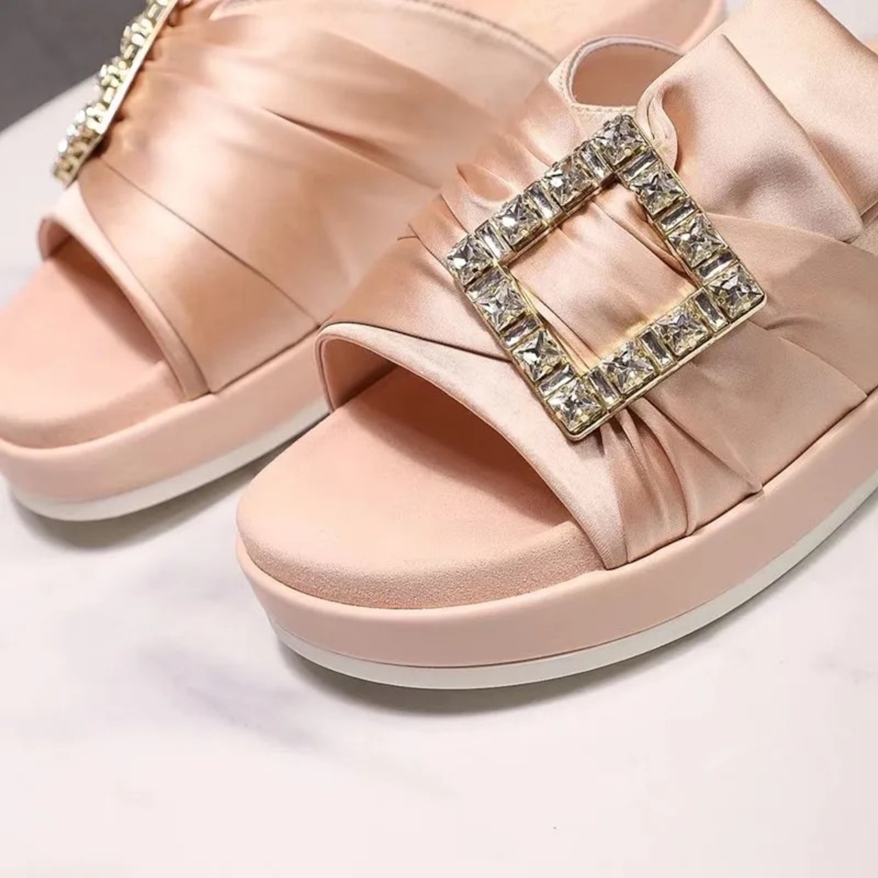 スクエアビジューにサテンリボンのデザインが可愛いサンダル。