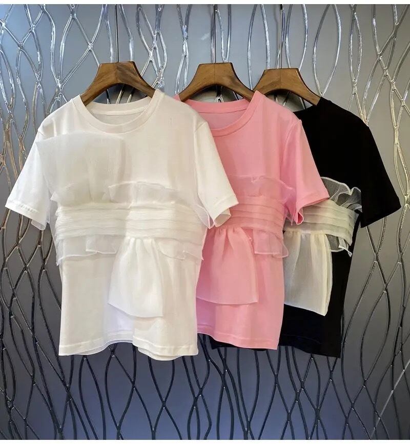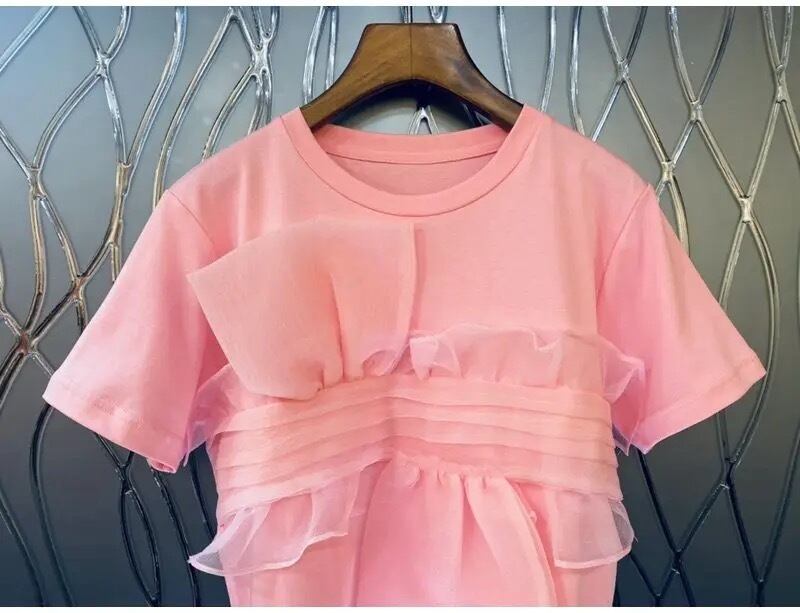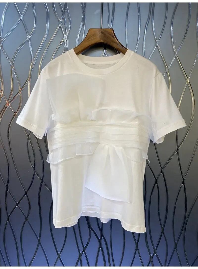 オーガンジーお素材のリボンとフリルが華やかなTシャツ。