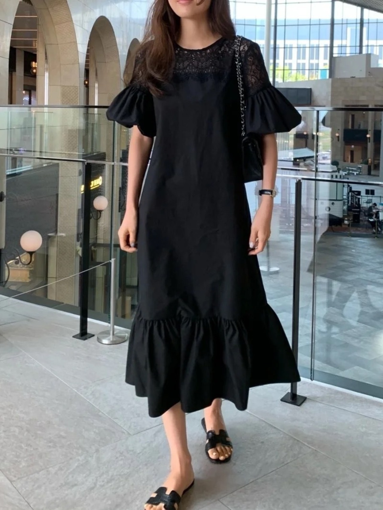 ショルダーレース切り替えに、お袖がバルーンデザインになったワンピース。