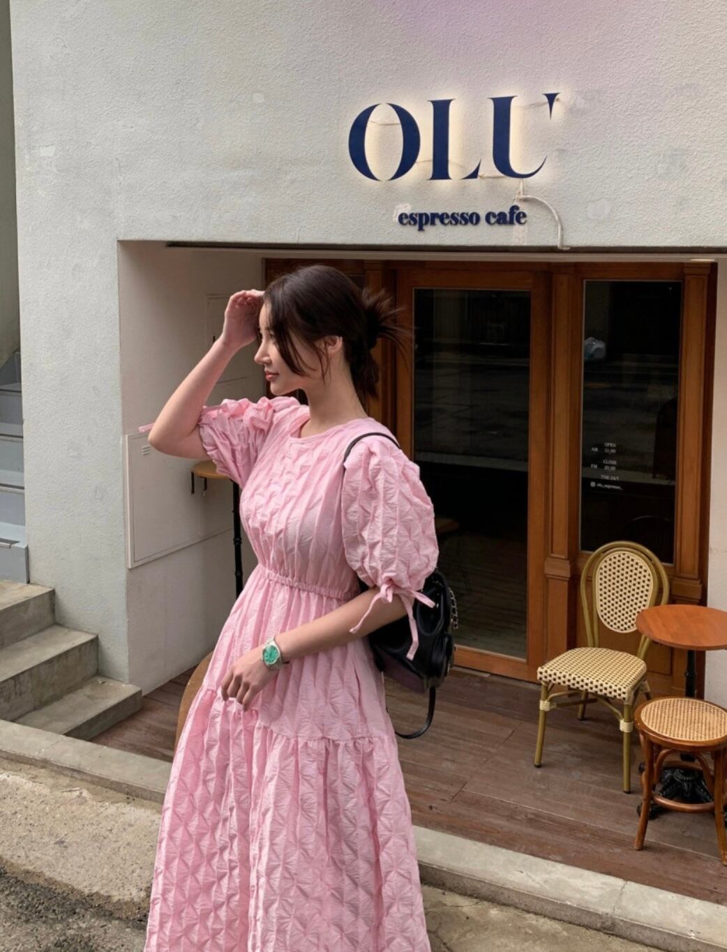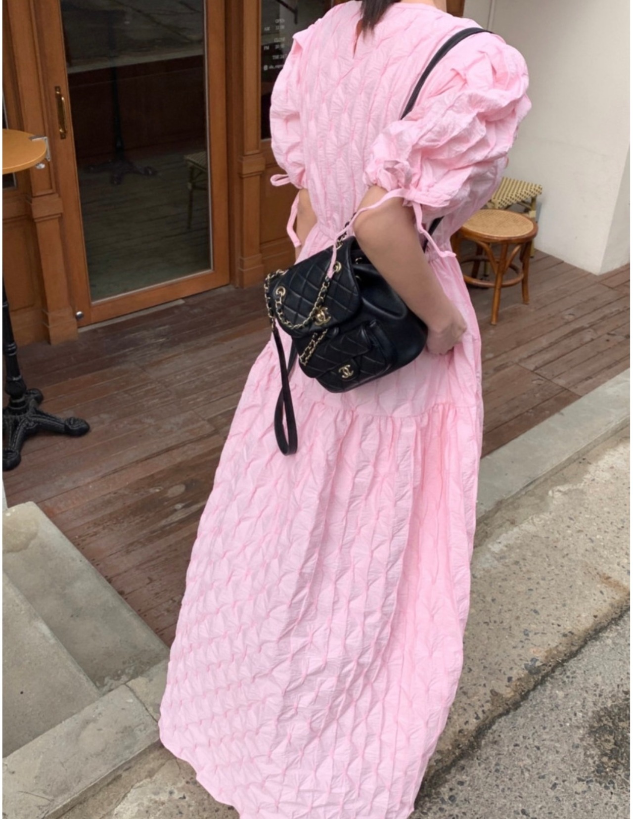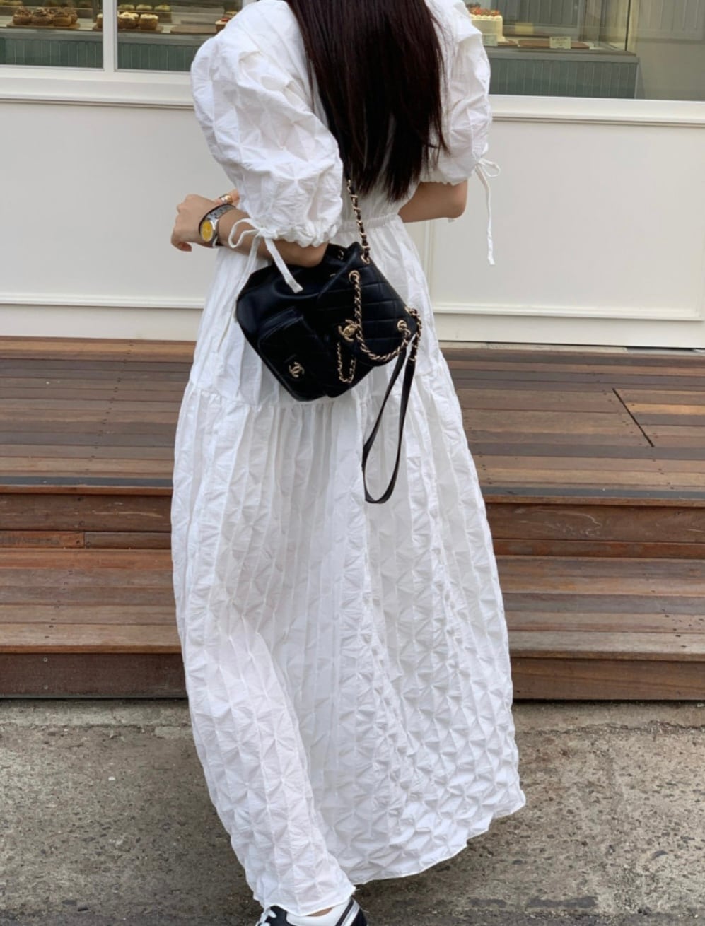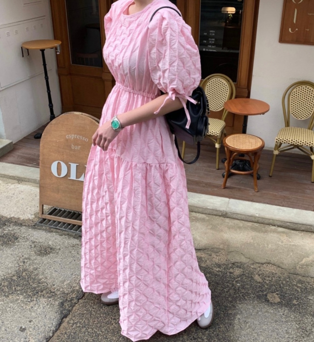 立体感あるお素材でデザインされたワンピース。