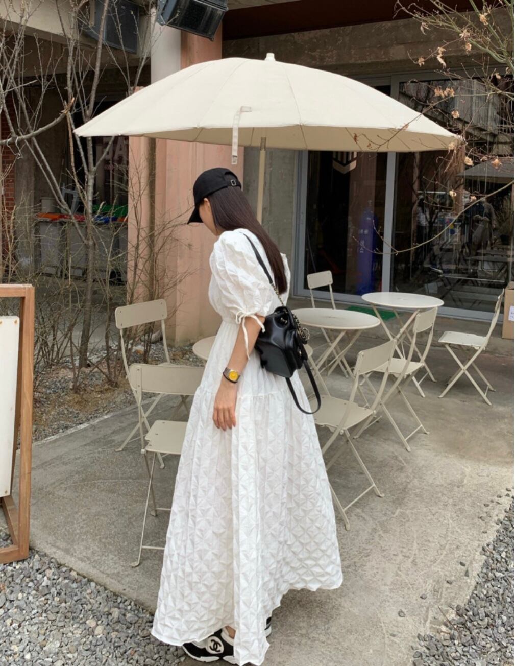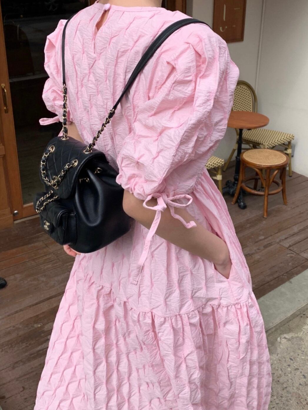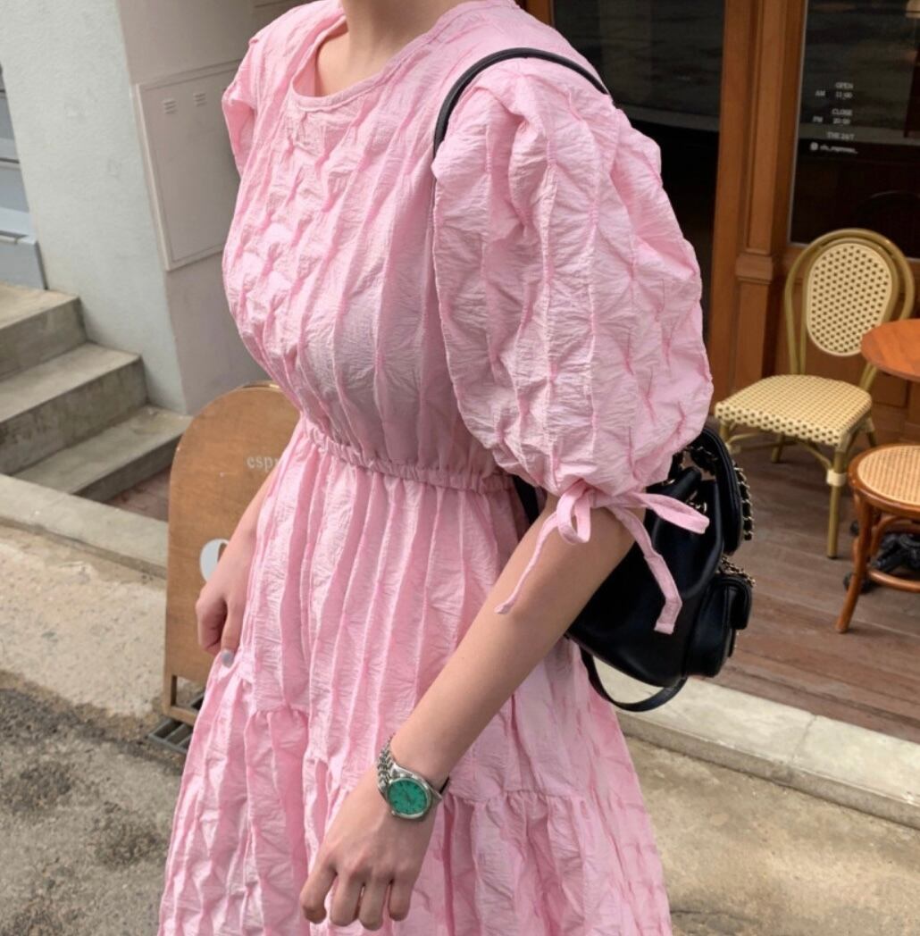 お袖ラインやリボンもアクセントになり、カジュアルな合わせにも映えるワンピースです。