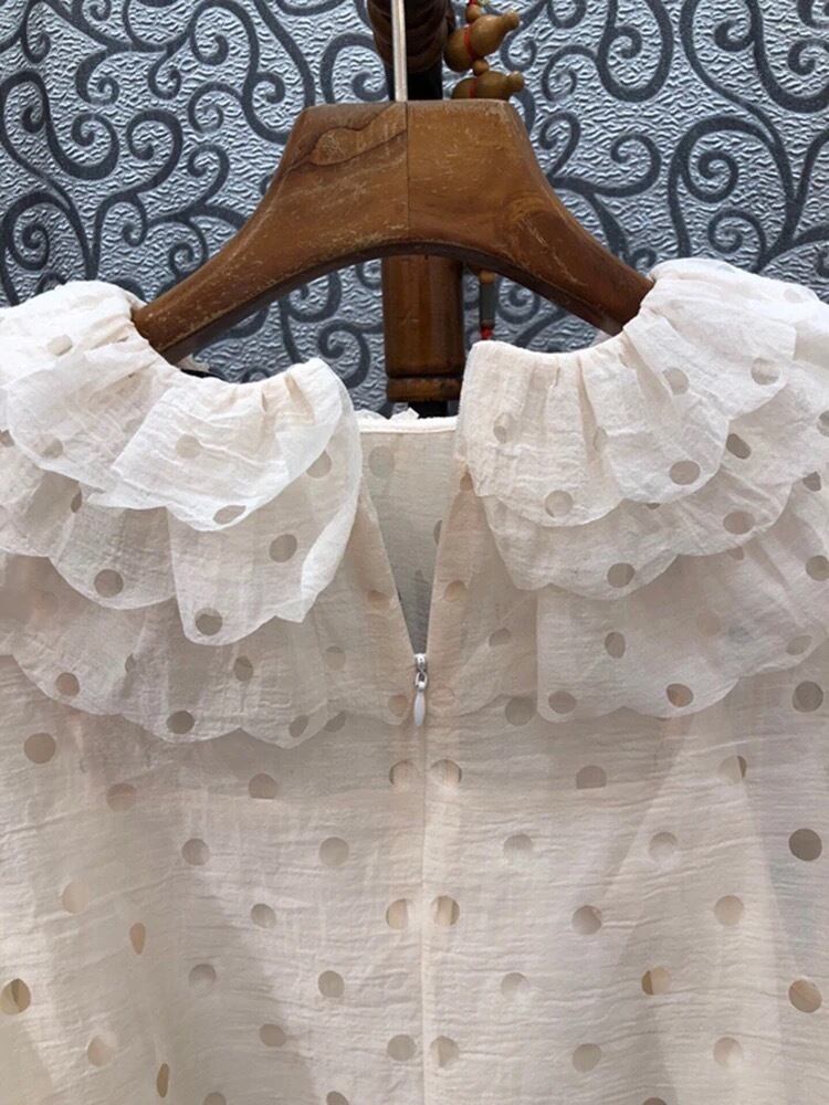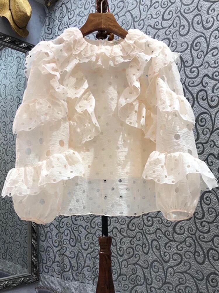 ドットのカットにスカラップのフリルがデザインされたブラウス。