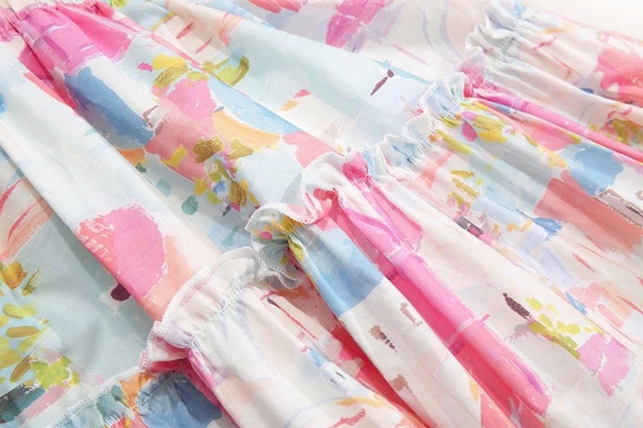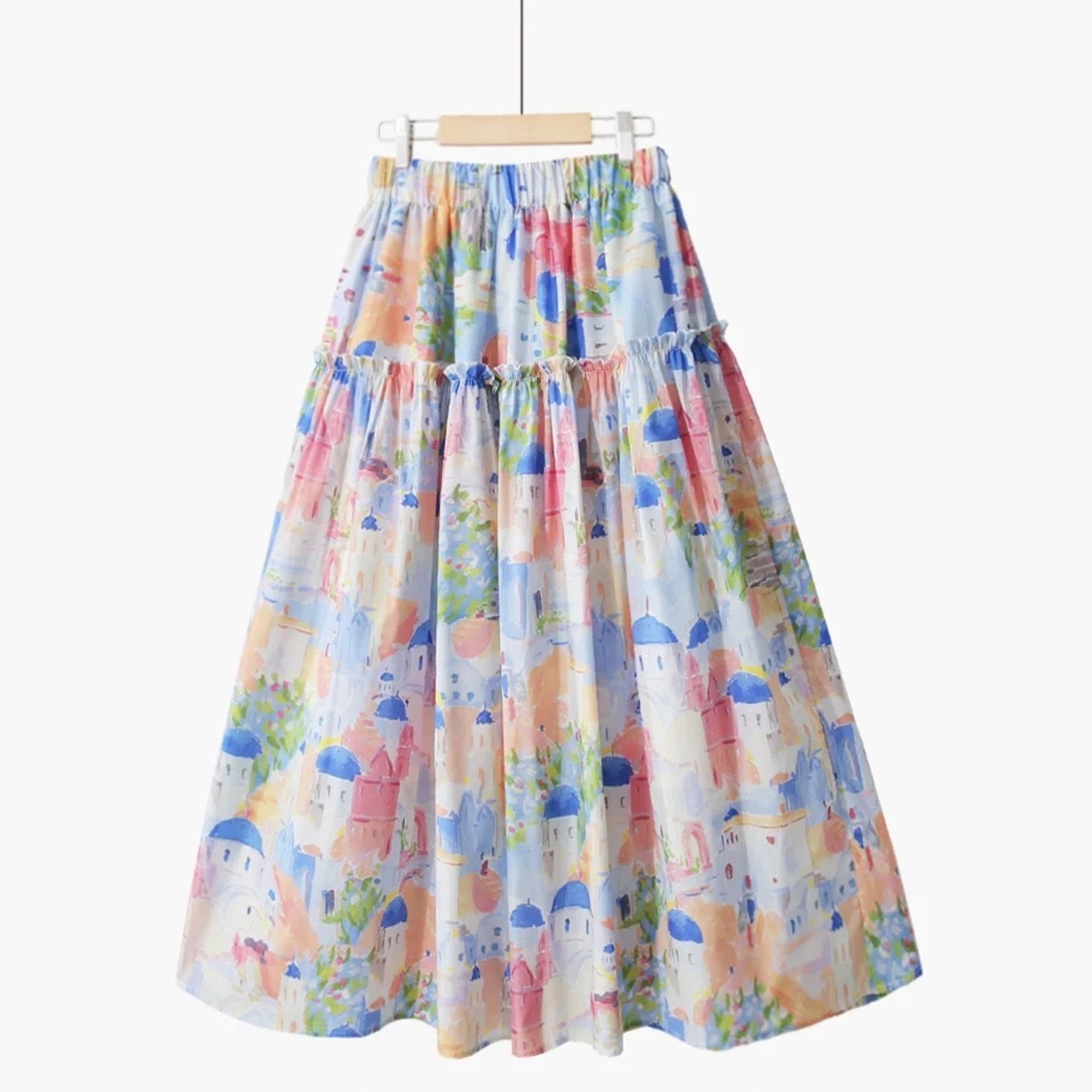 水彩画プリントでヨーロッパの街並みがデザインされたスカート。