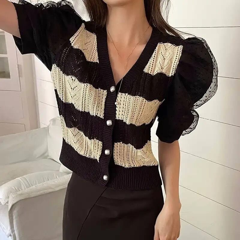 ドットチュールのお袖にボーダーデザインのカーディガン。