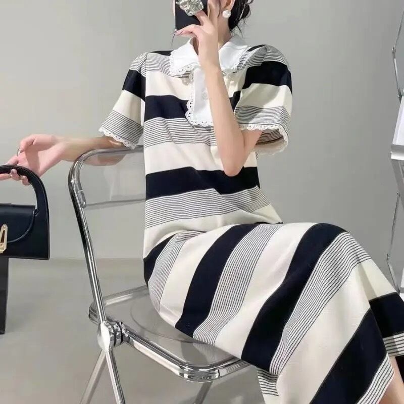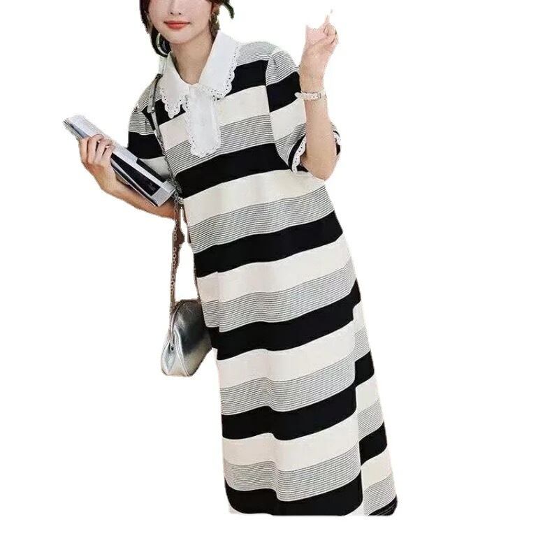 お袖と襟元のレースカラーがアクセントのボーダーワンピース。