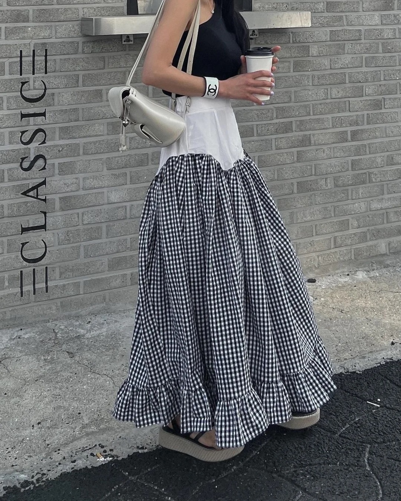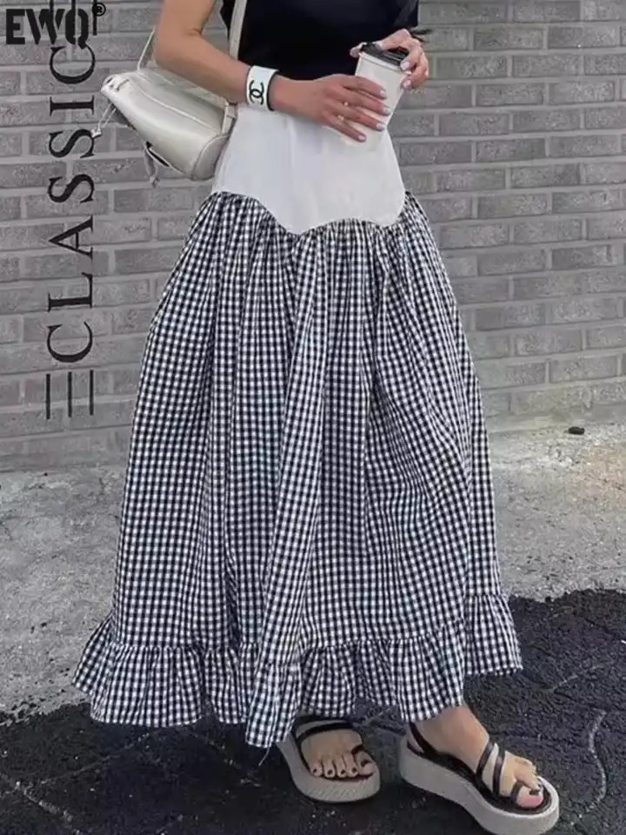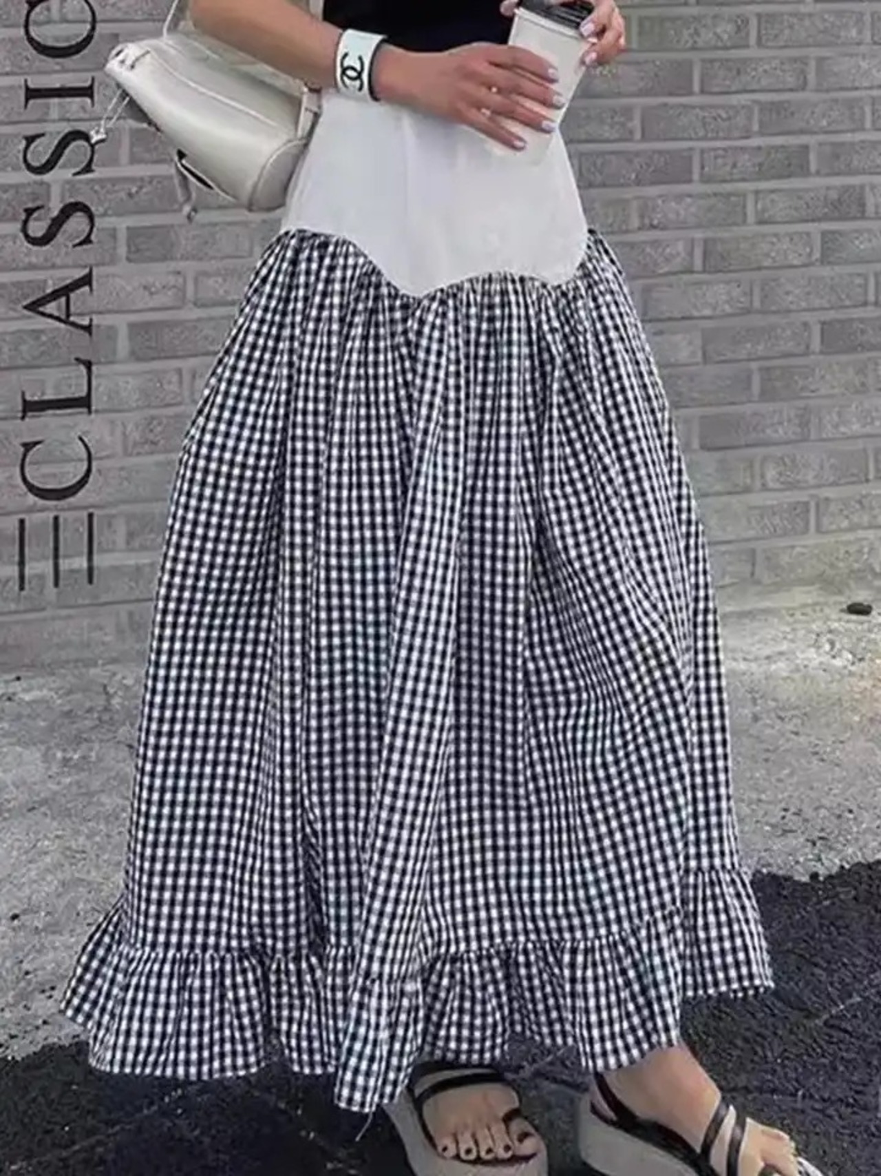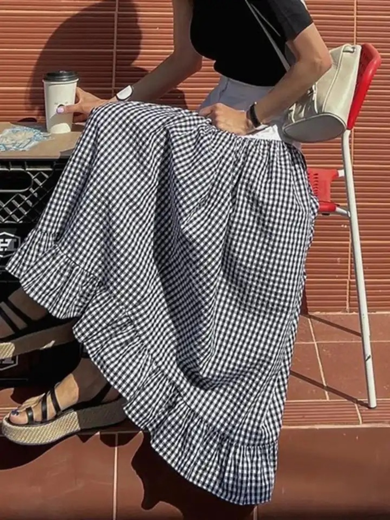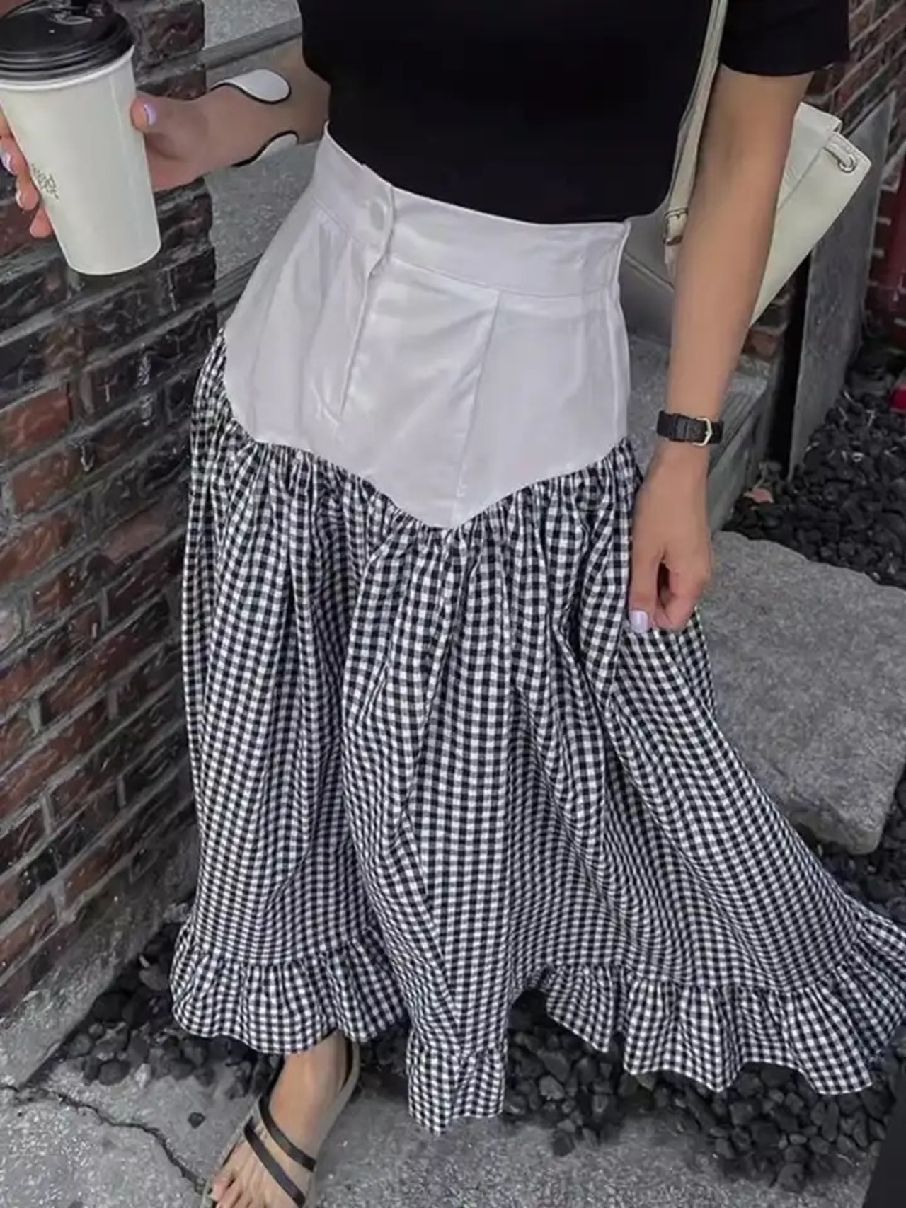 ドッキングデザインのギンガムチェックスカート。