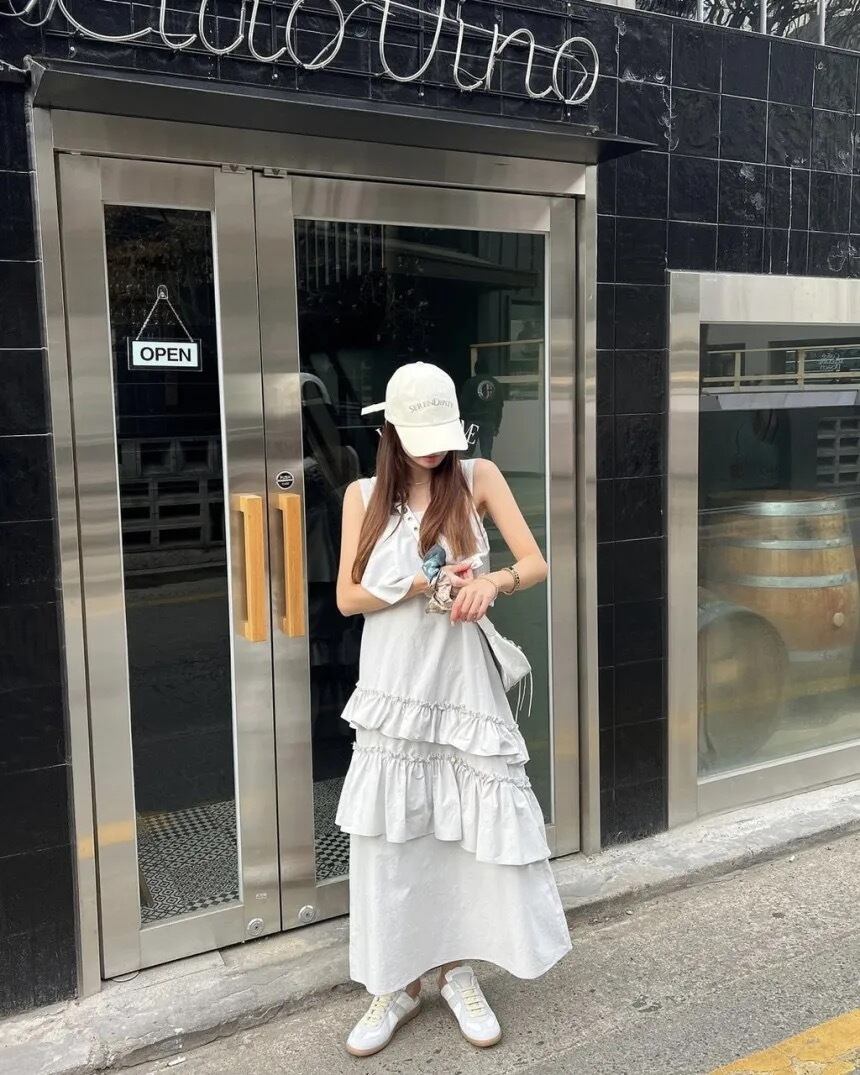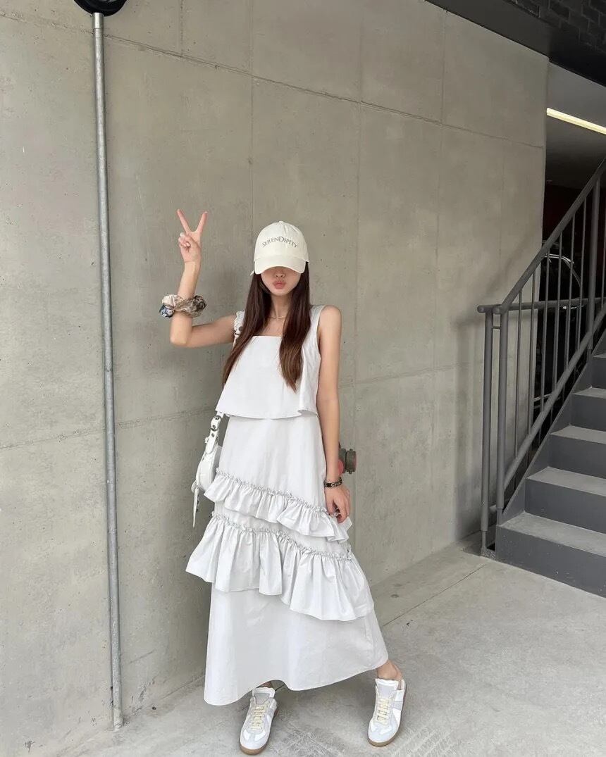 重ね着風のトップス部分にフリルが映えるワンピース。