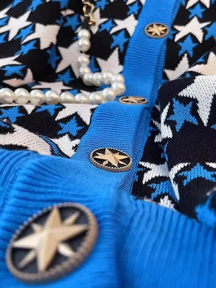 配色カラーのスターに、ボタンもアクセントのカーディガンはシンプルなコーデに映えるデザインに。