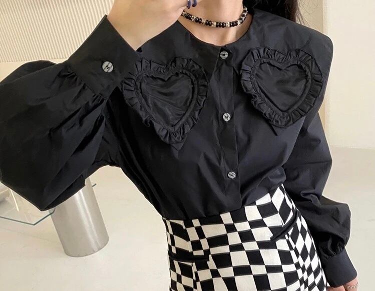 ハート型にカットされたデザインの襟元にインパクトあるブラウス。