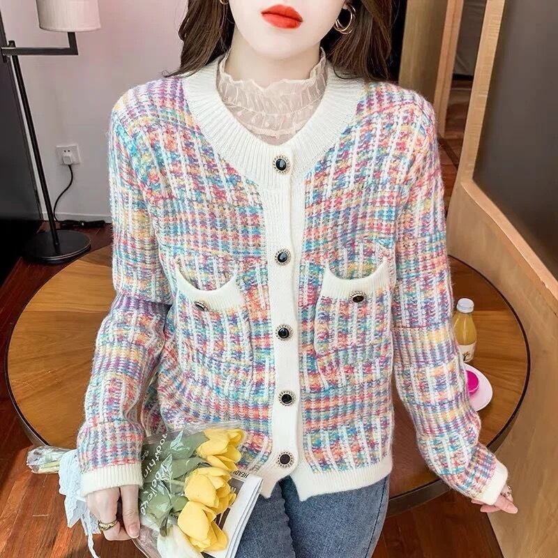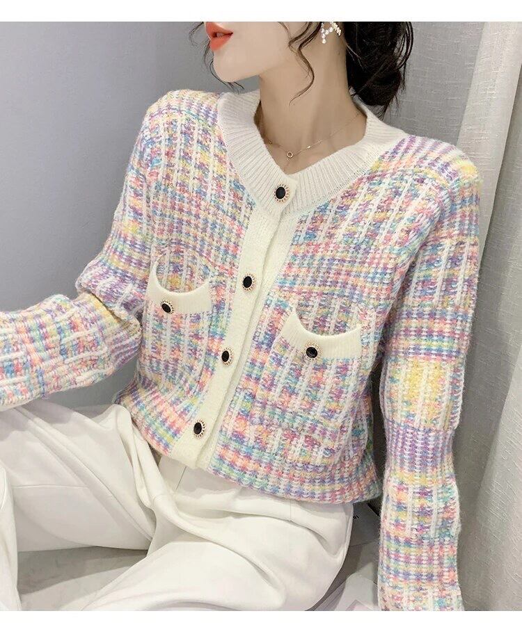 ミックスカラーのニットにビジューボタンが華やかなニットカーディガン。