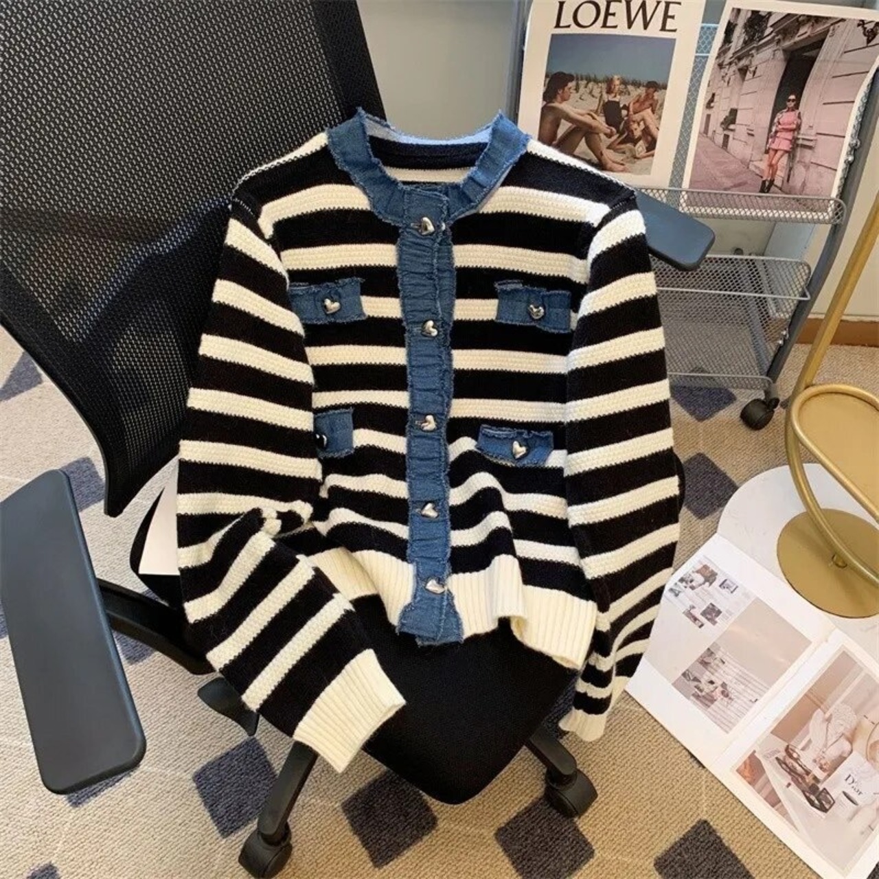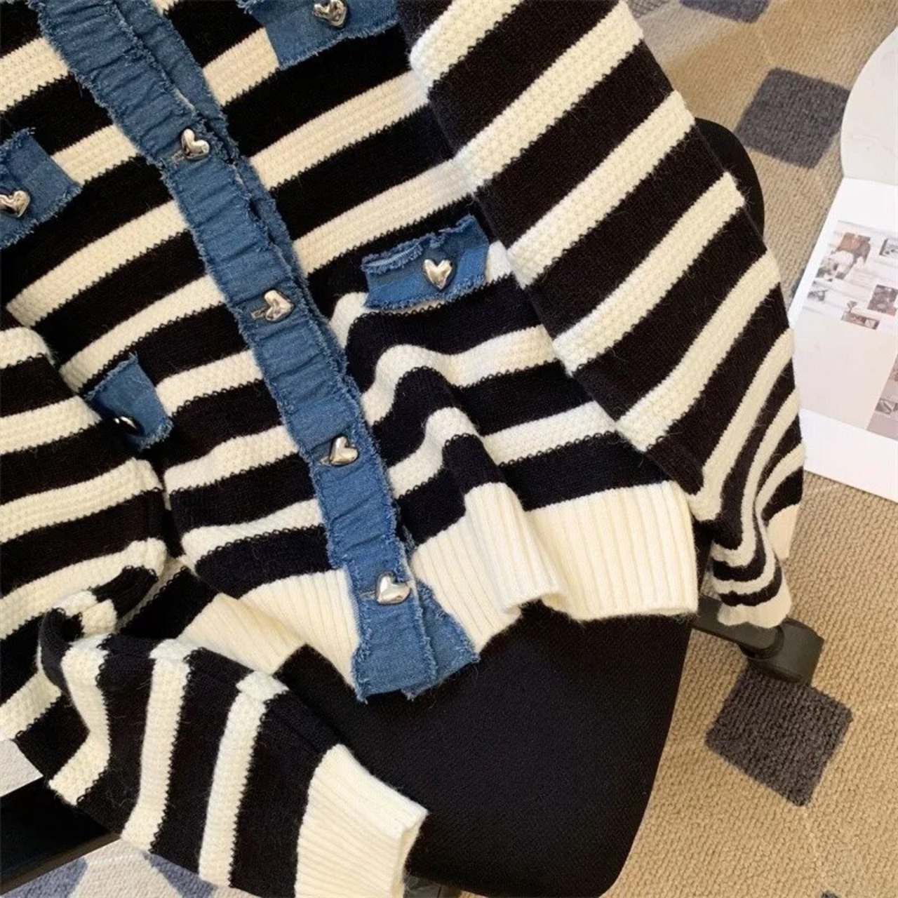 デニムがドッキングになったボーダーカーディガンにハートボタンがアクセントのカーディガン。