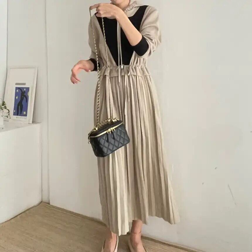 バイカラーのトップス部分やフード、プリーツデザインのワンピース。
