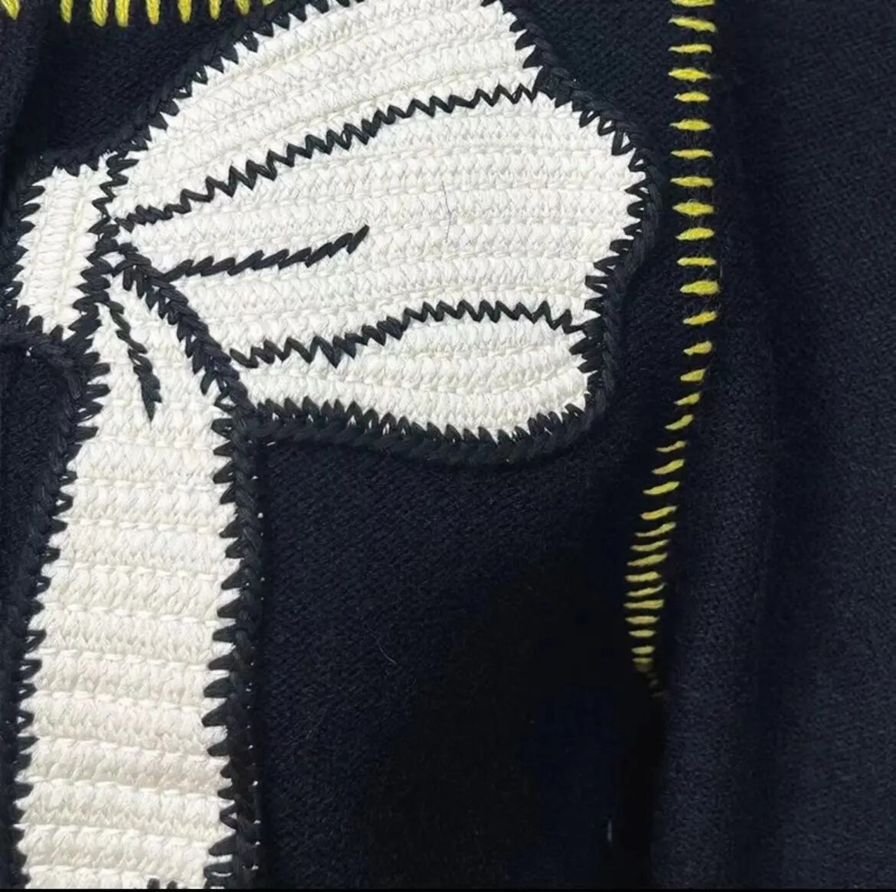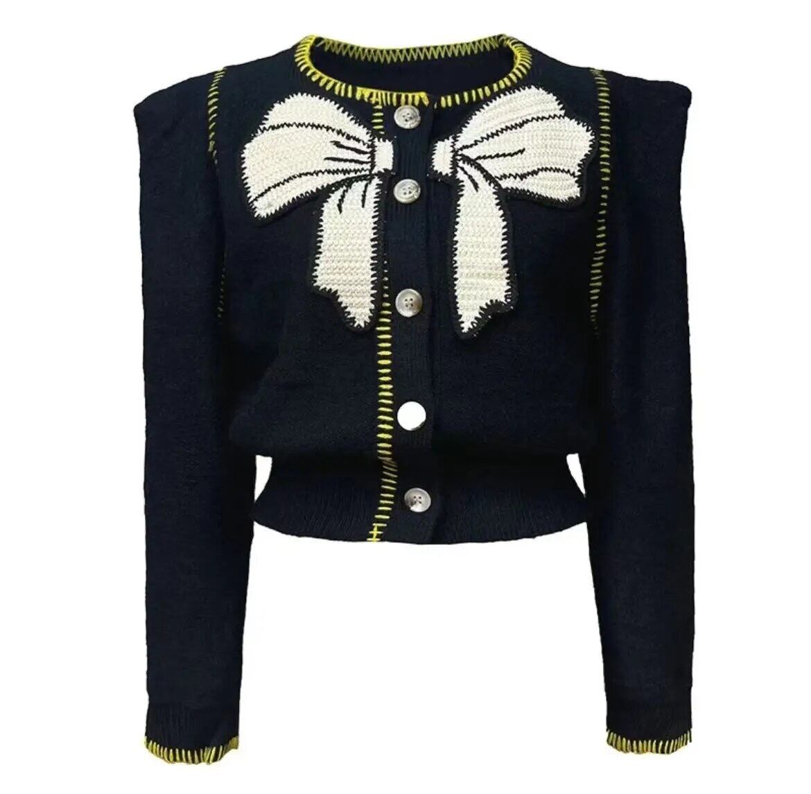 イエローのステッチが映えるニットカーディガンは、リボンデザインが華やかに。