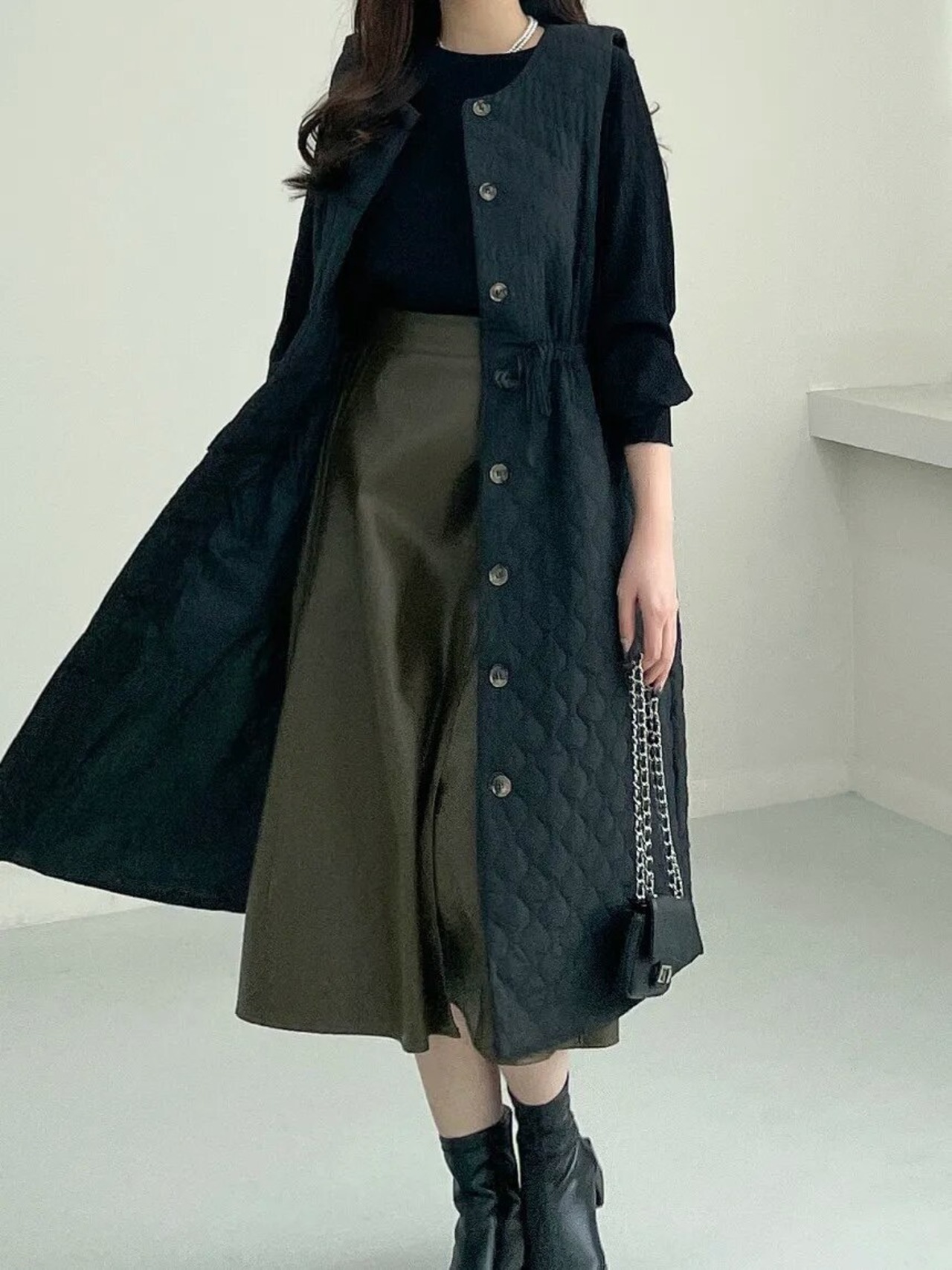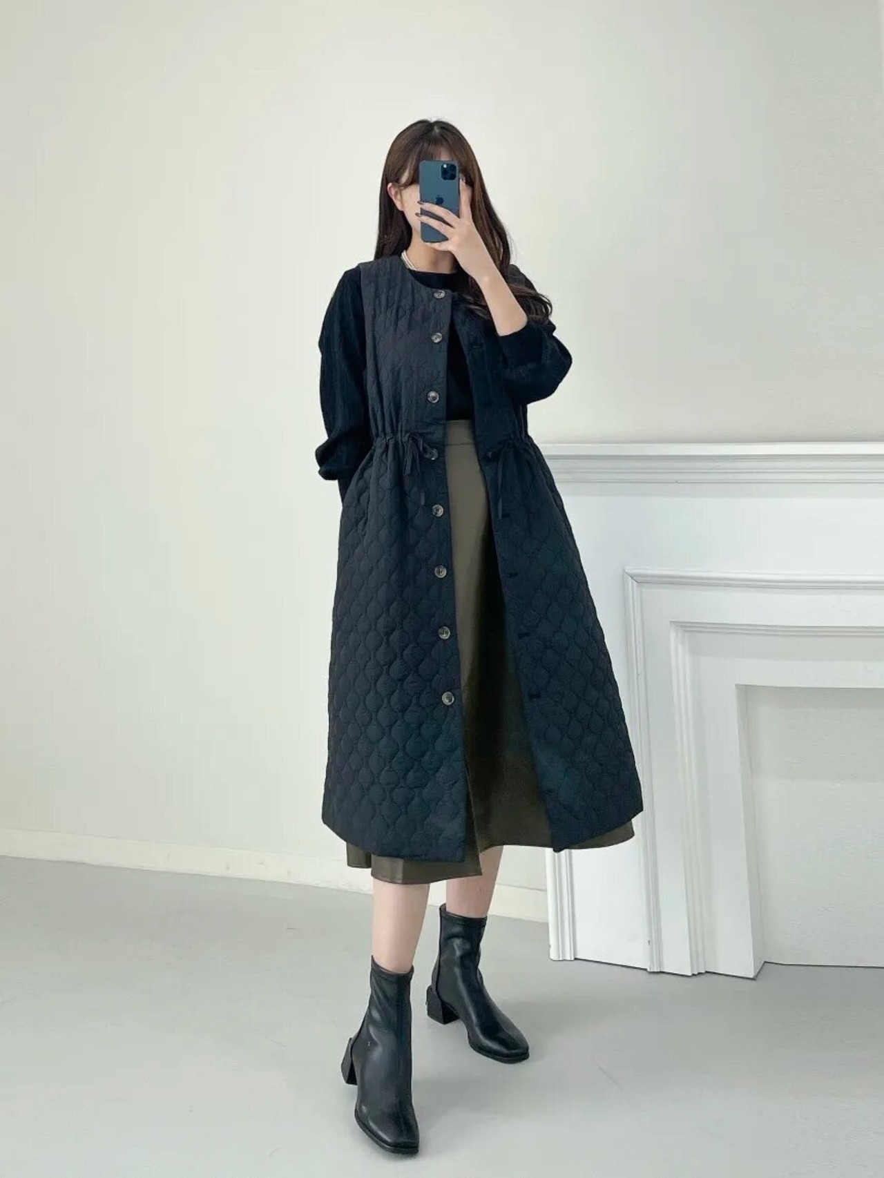 キルティングデザインにウエストリボンがアクセントのジレ。
