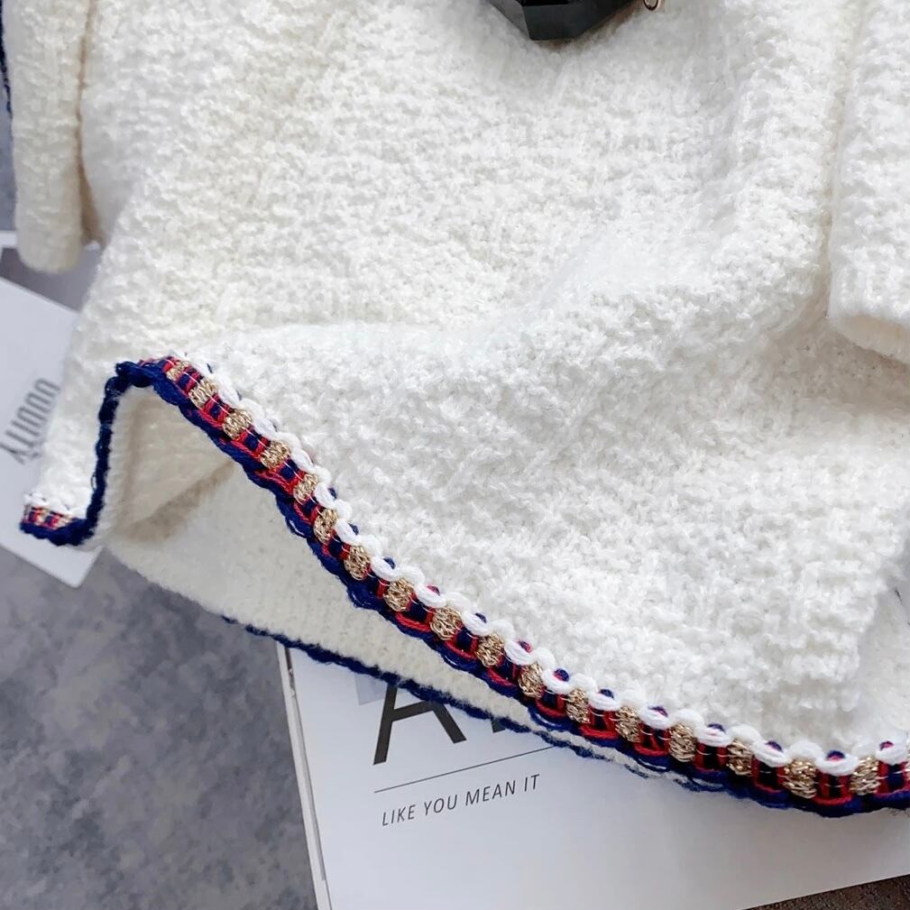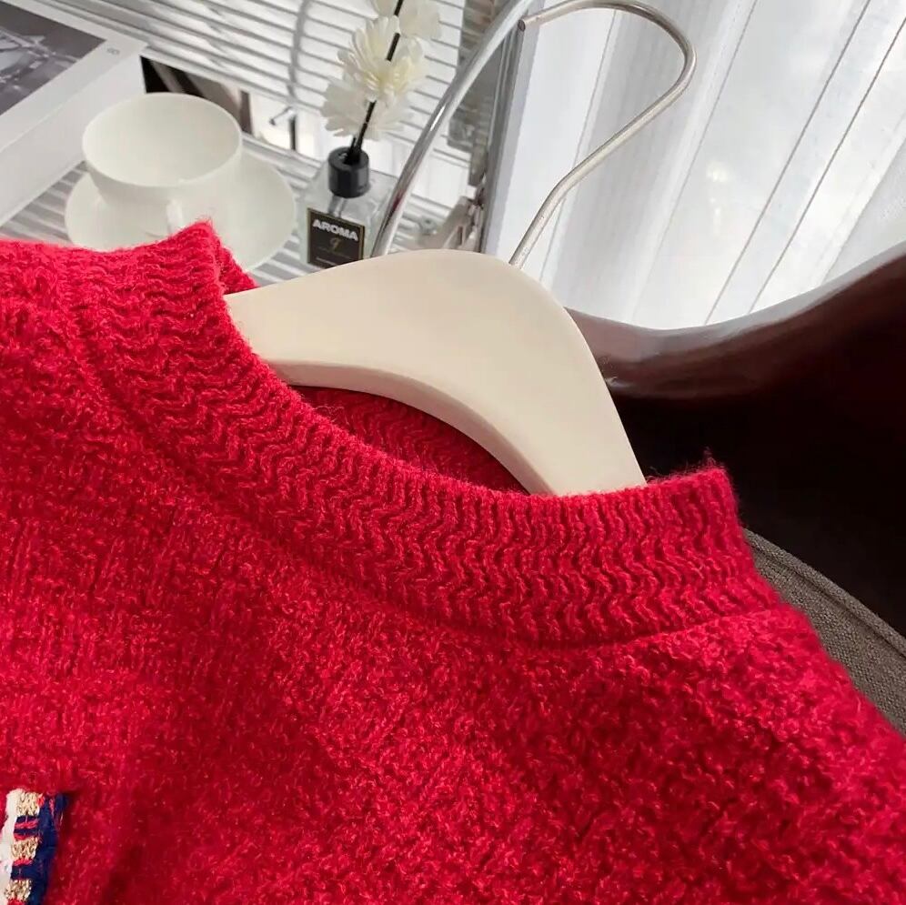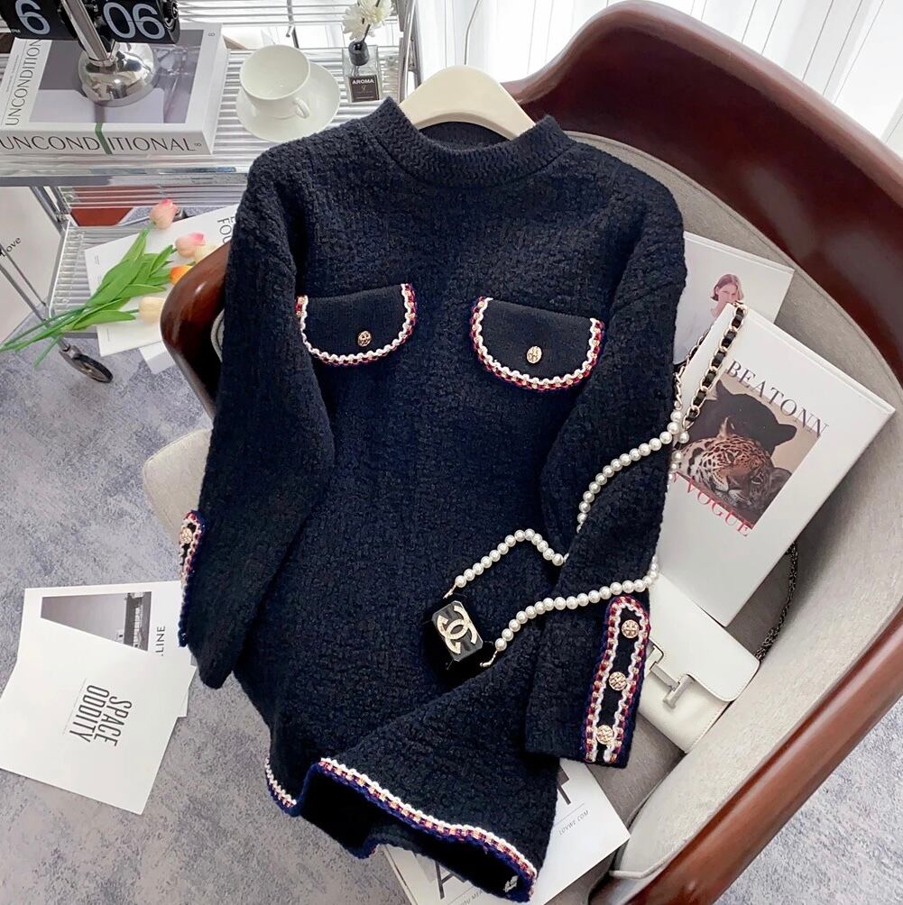 ツイードジャケットのような配色やボタンデザインがアクセントのニット。