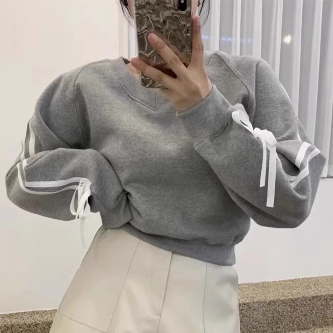 カジュアルなラインとフェミニンなリボンの組み合わせがオシャレに。