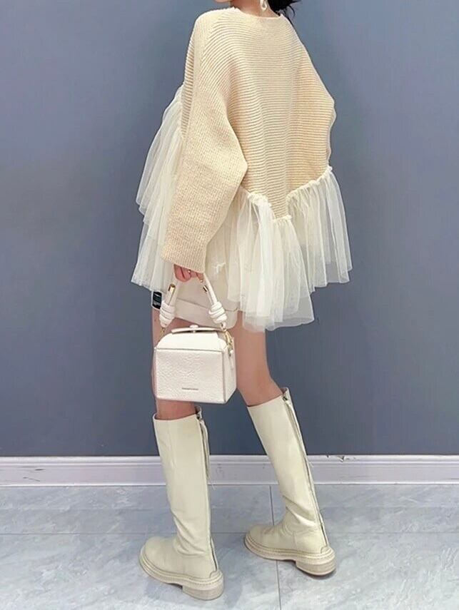 アシンメトリーにデザインされたチュールが華やかなニット。