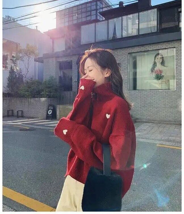 お袖や胸元にポイントデザインされたハートが可愛いニット。