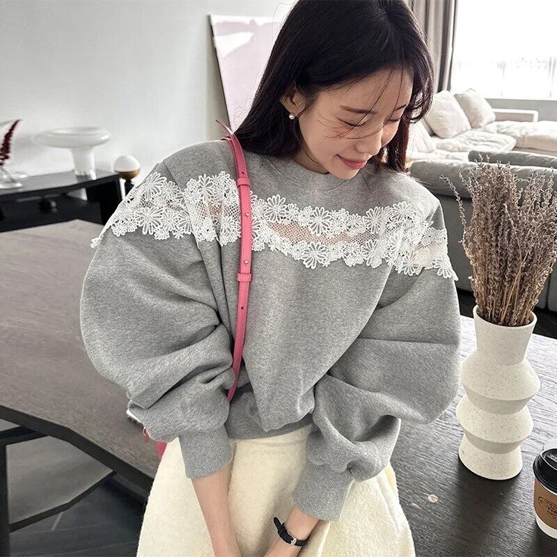 カジュアルなスウェットお素材と、エレガントなレースのミックスデザインがオシャレなトップスです。
