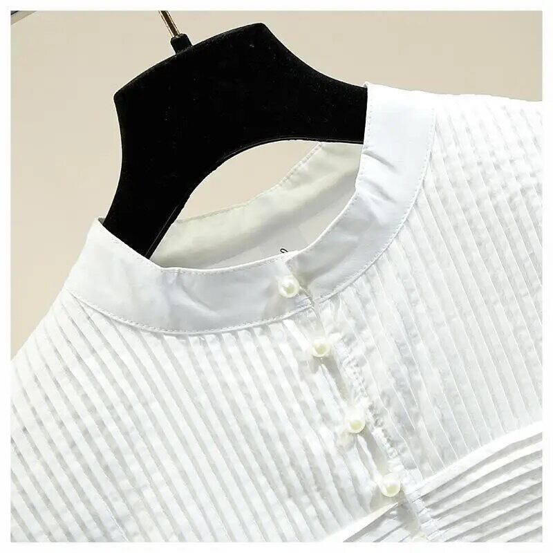 タックとフリルデザインにパールボタンが華やかなブラウス。
