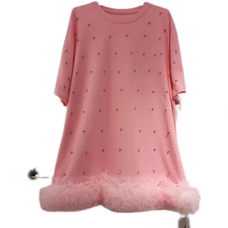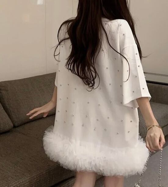 ビジューデザインに裾チュールが華やかなTシャツワンピース。