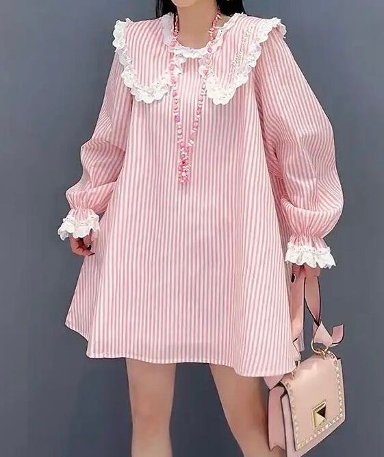 レースビッグカラーがアクセントのストライプワンピース。