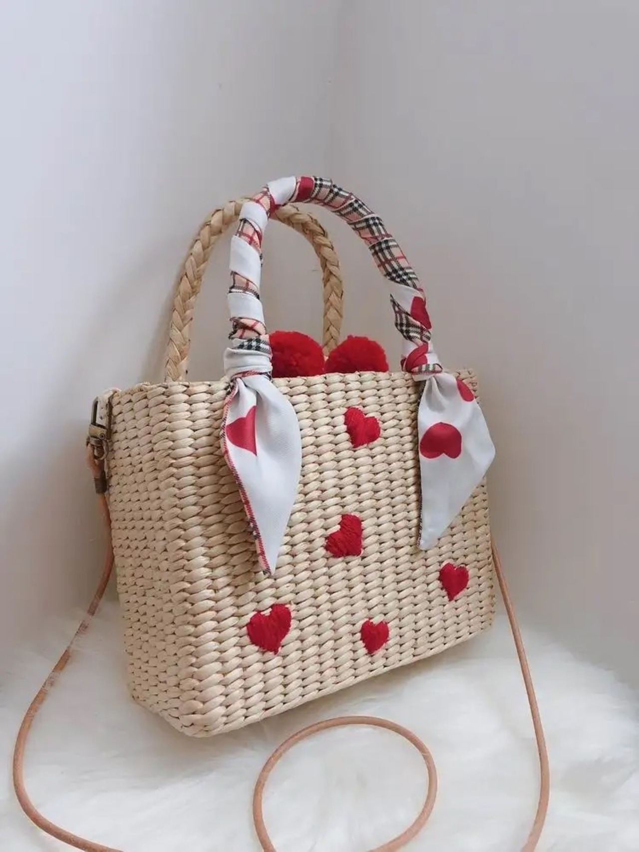 ハート刺繍デザインのストローバッグ。