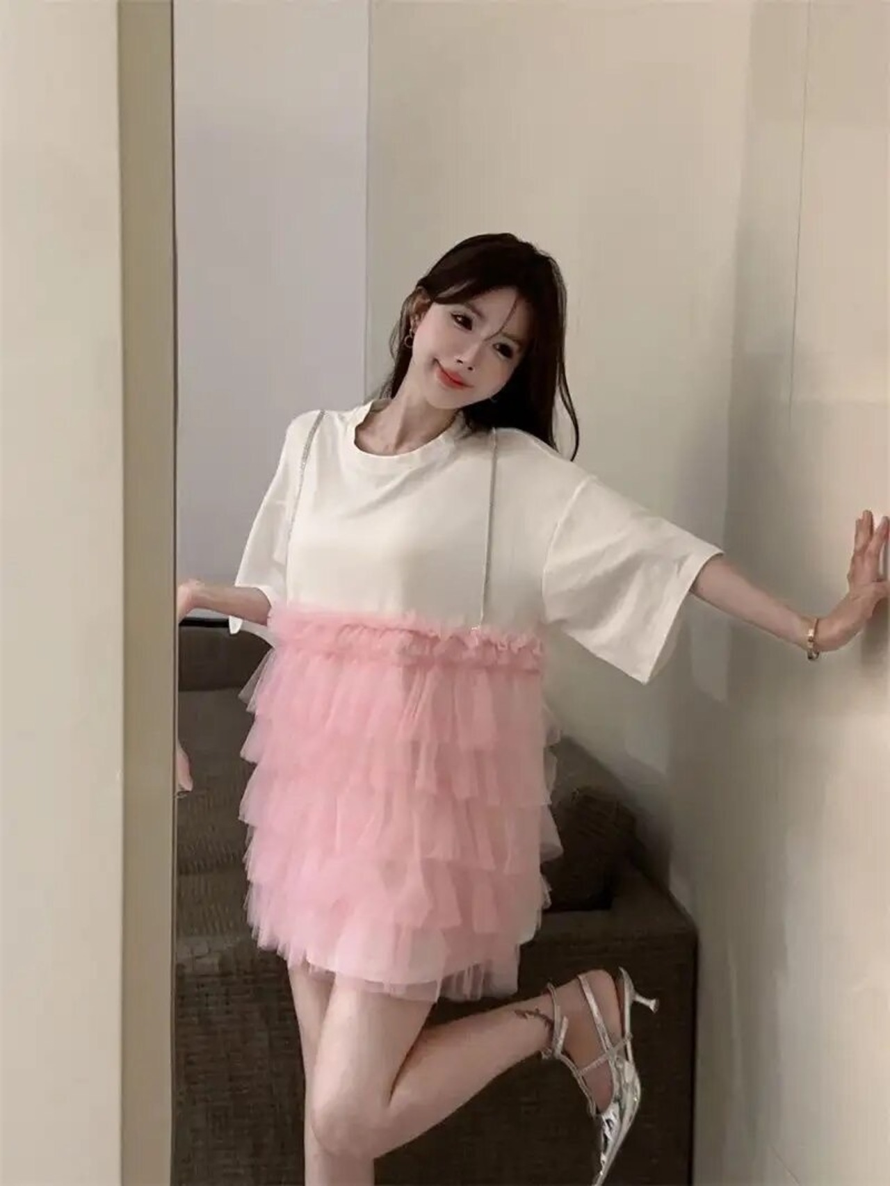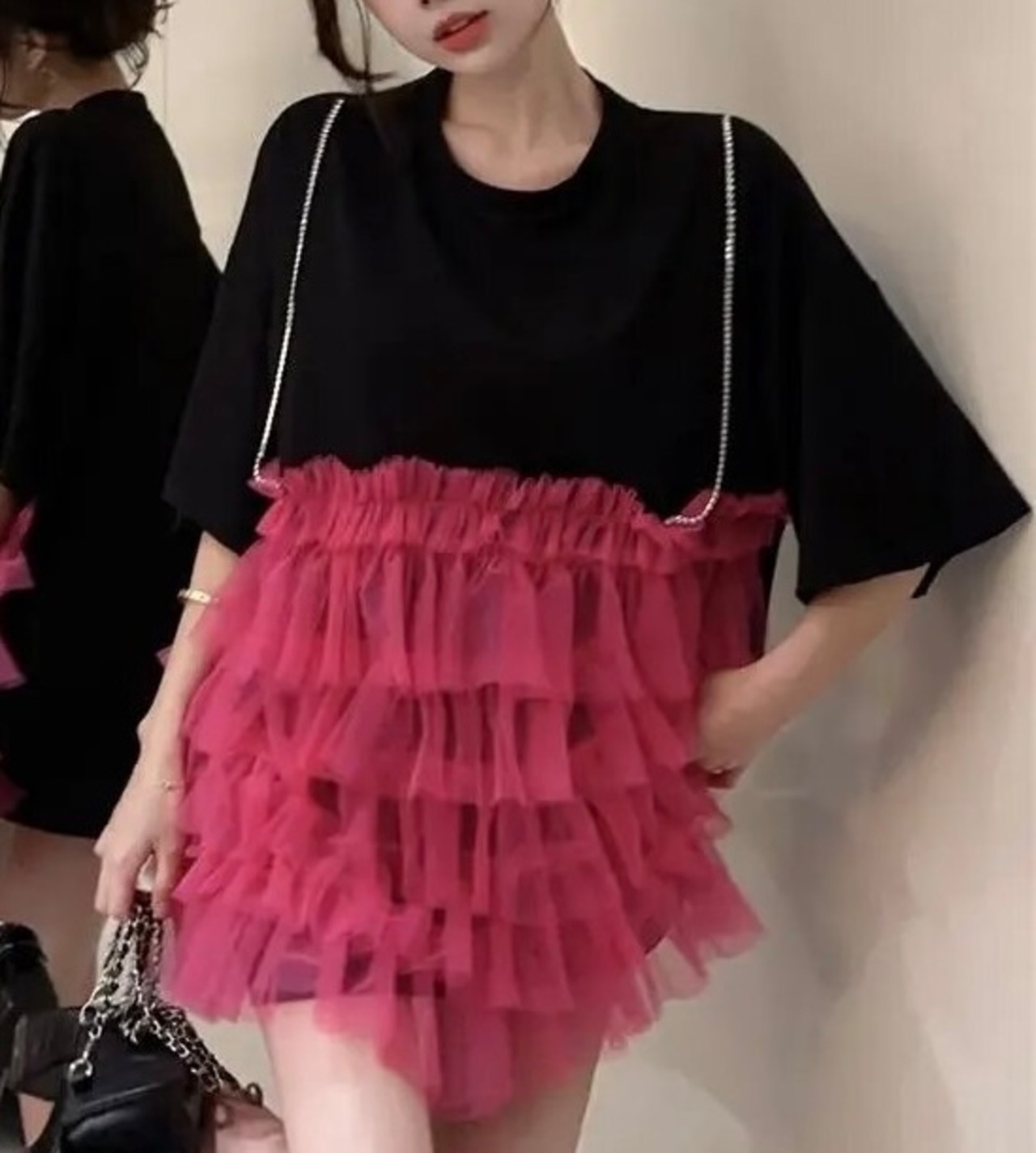 ティアードチュールがドッキングになった重ね着風ワンピース。
