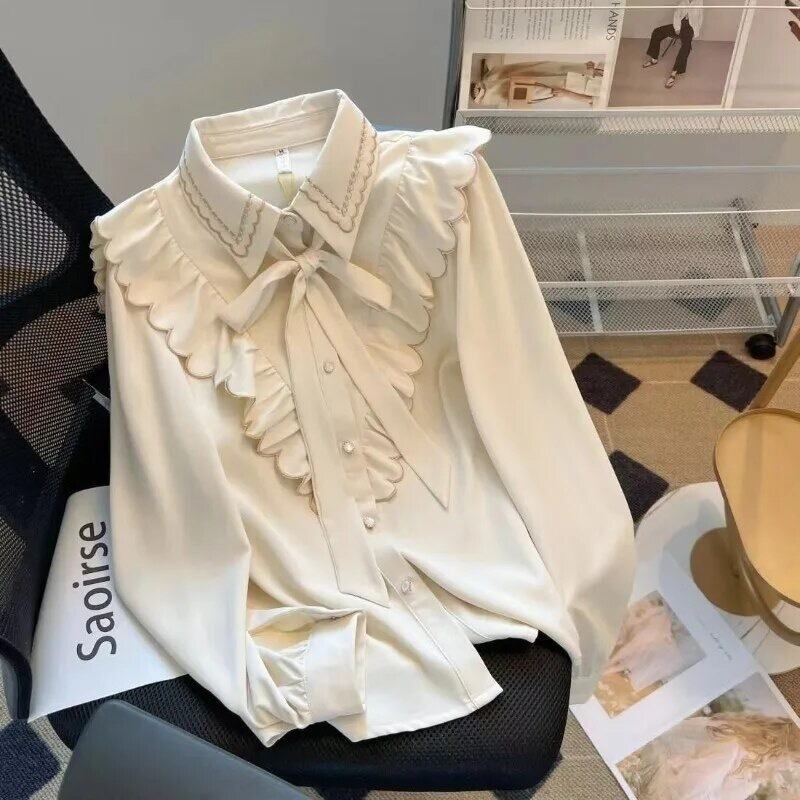 スカラップの襟元やフリルがデザインされたブラウス。