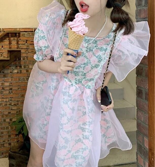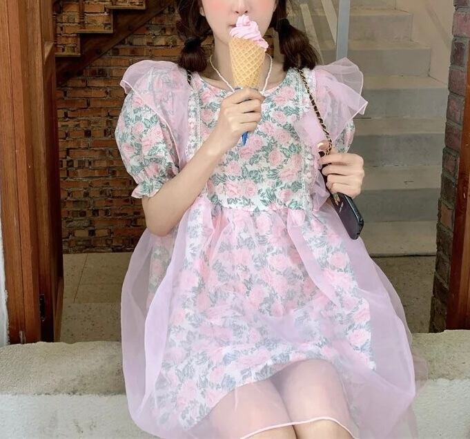 フラワープリントにフリルが華やかなトップスはカジュアルなデニム合わせにも映えるデザインに。