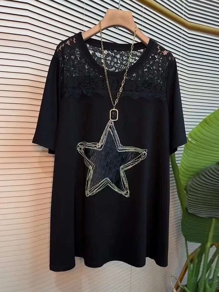 スターデザインのTシャツ。レースドッキングになっていて甘辛なデザインがオシャレに。