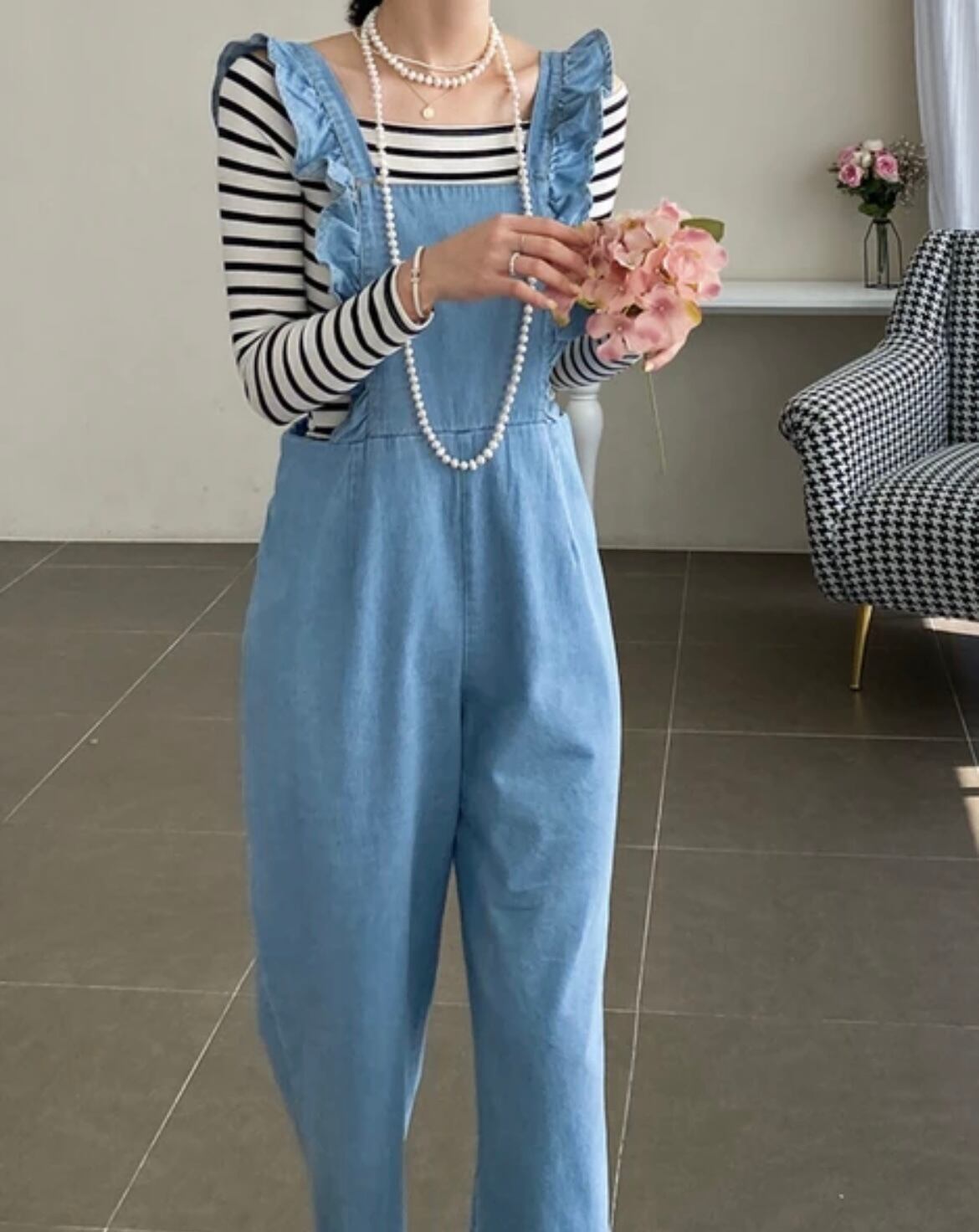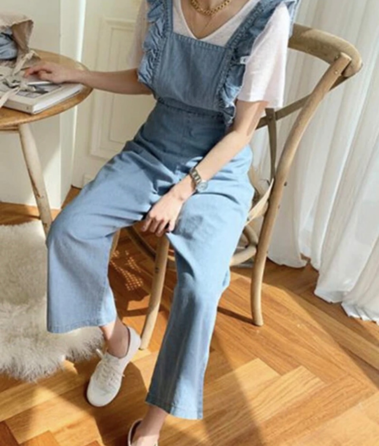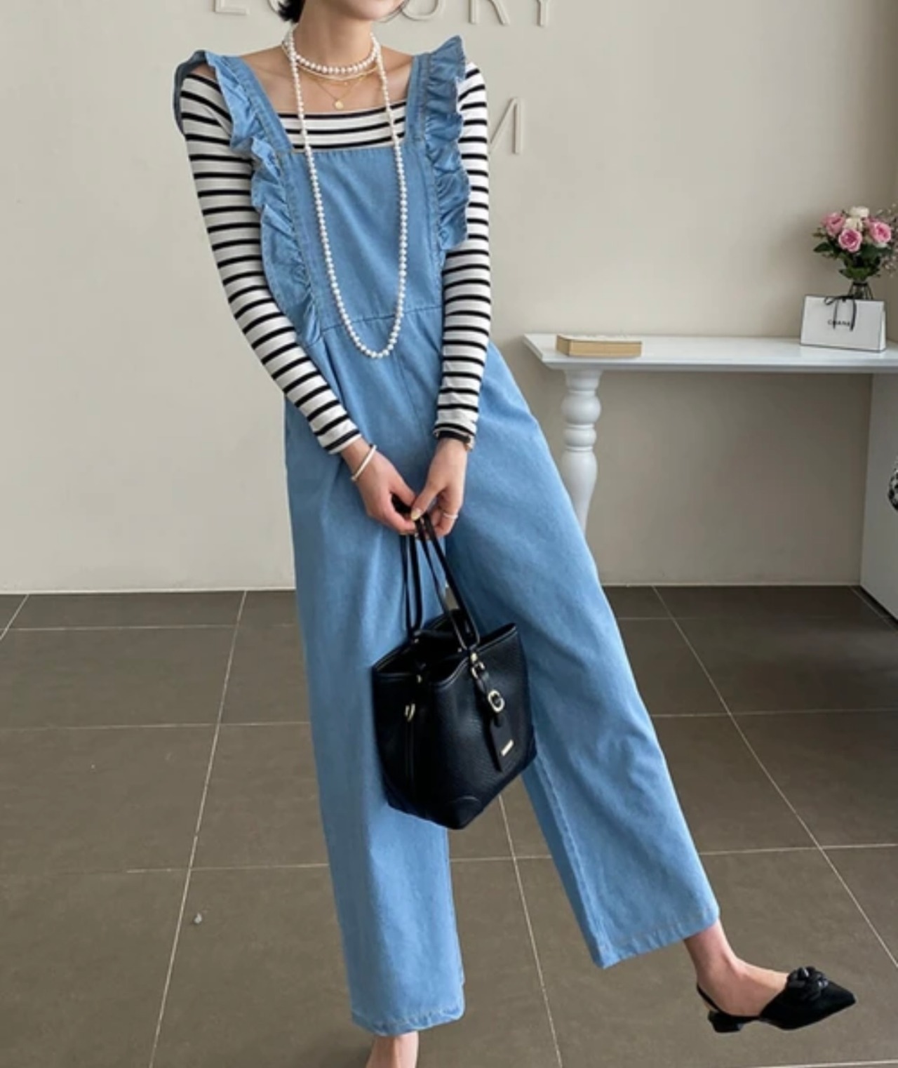 ・フリルがとても可愛らしいデニム素材のオールインワンです。