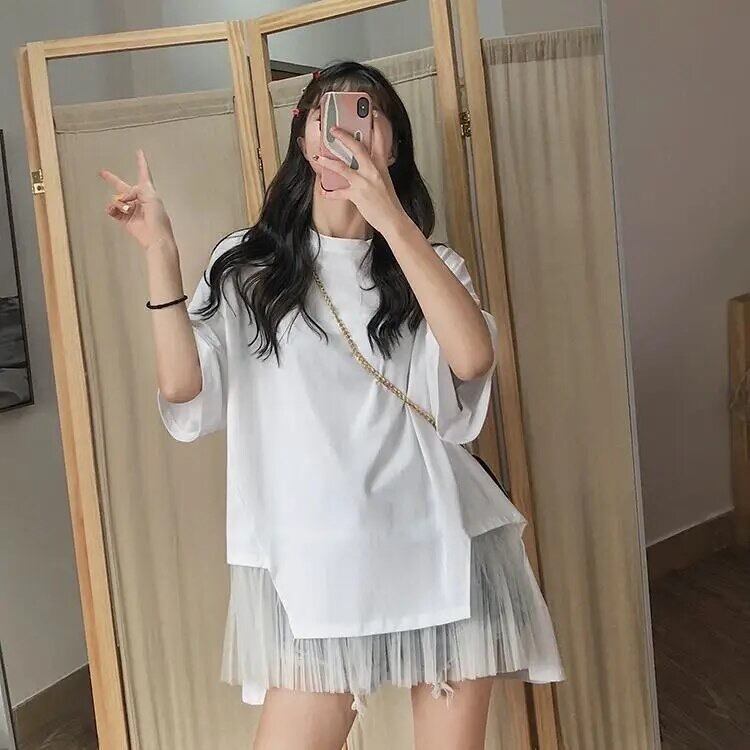 プリーツチュールが裾部分にデザインされたTシャツ。