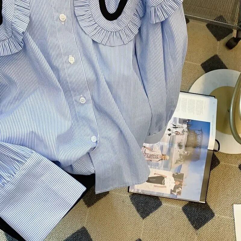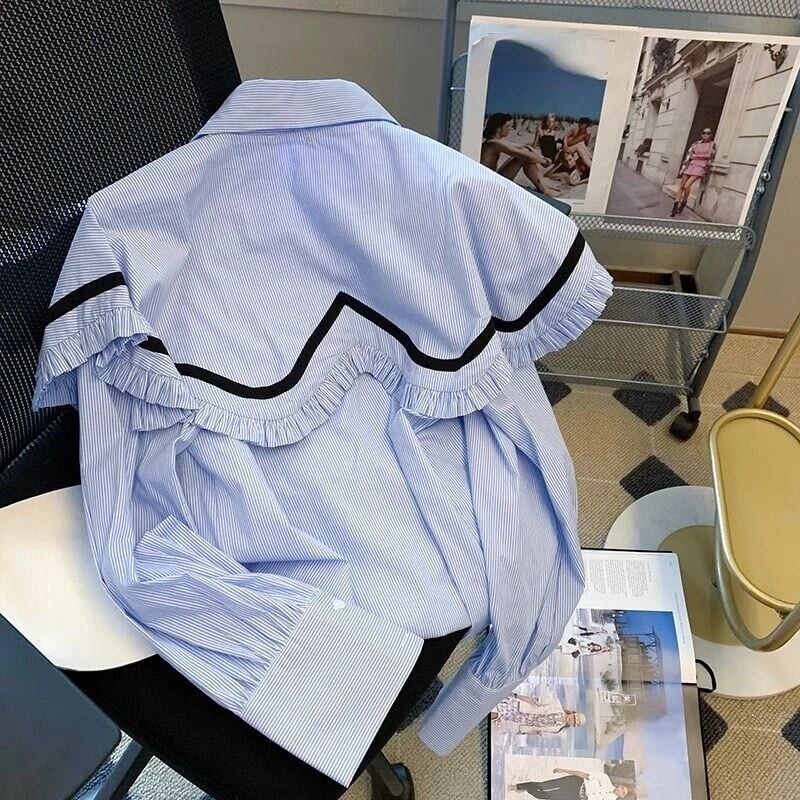 配色フリルのビッグカラーがデザインされたストライプブラウス。