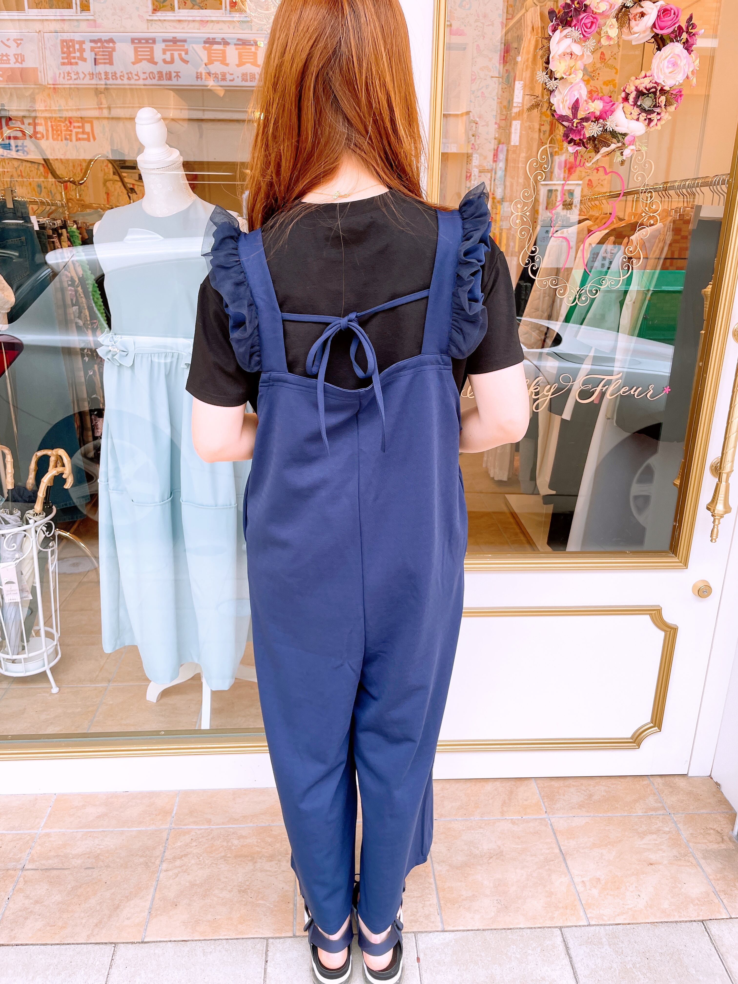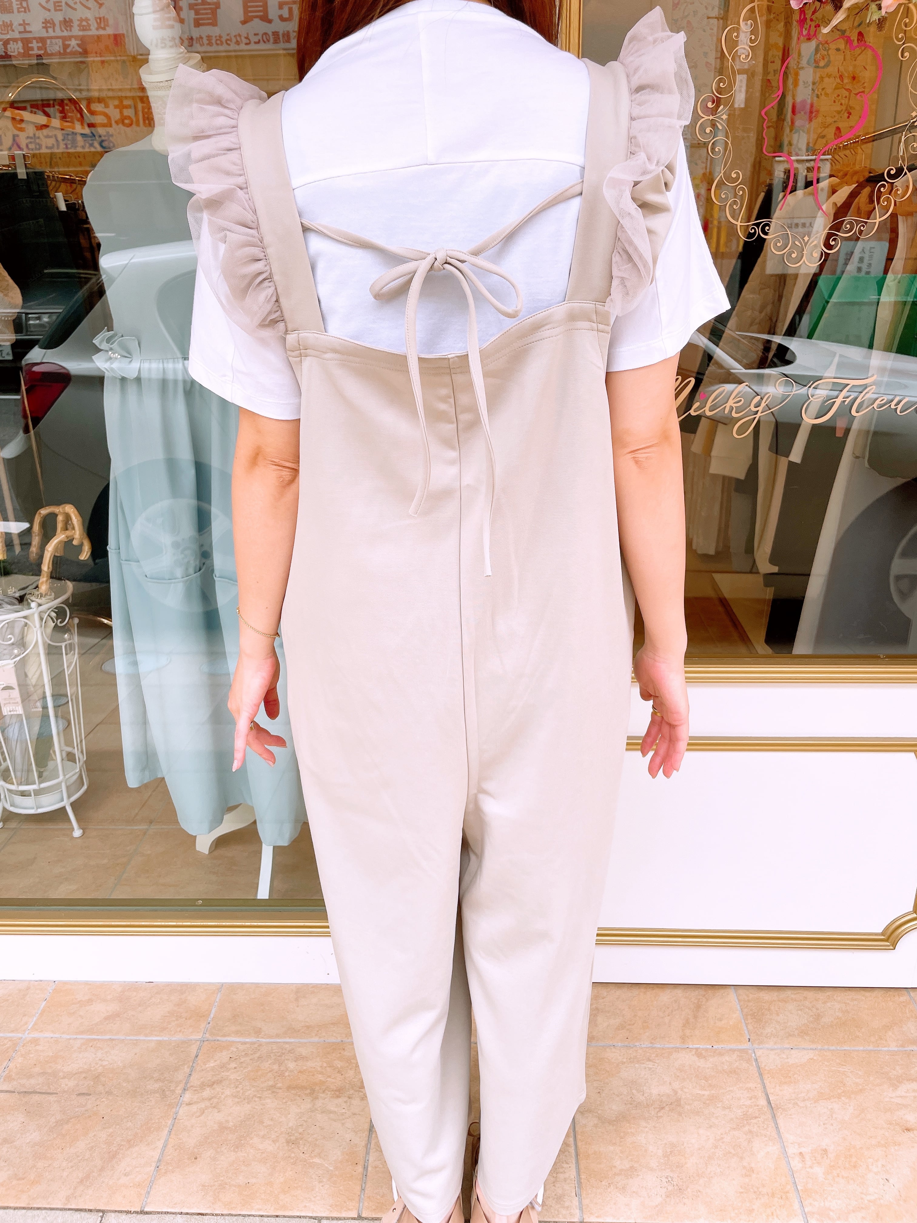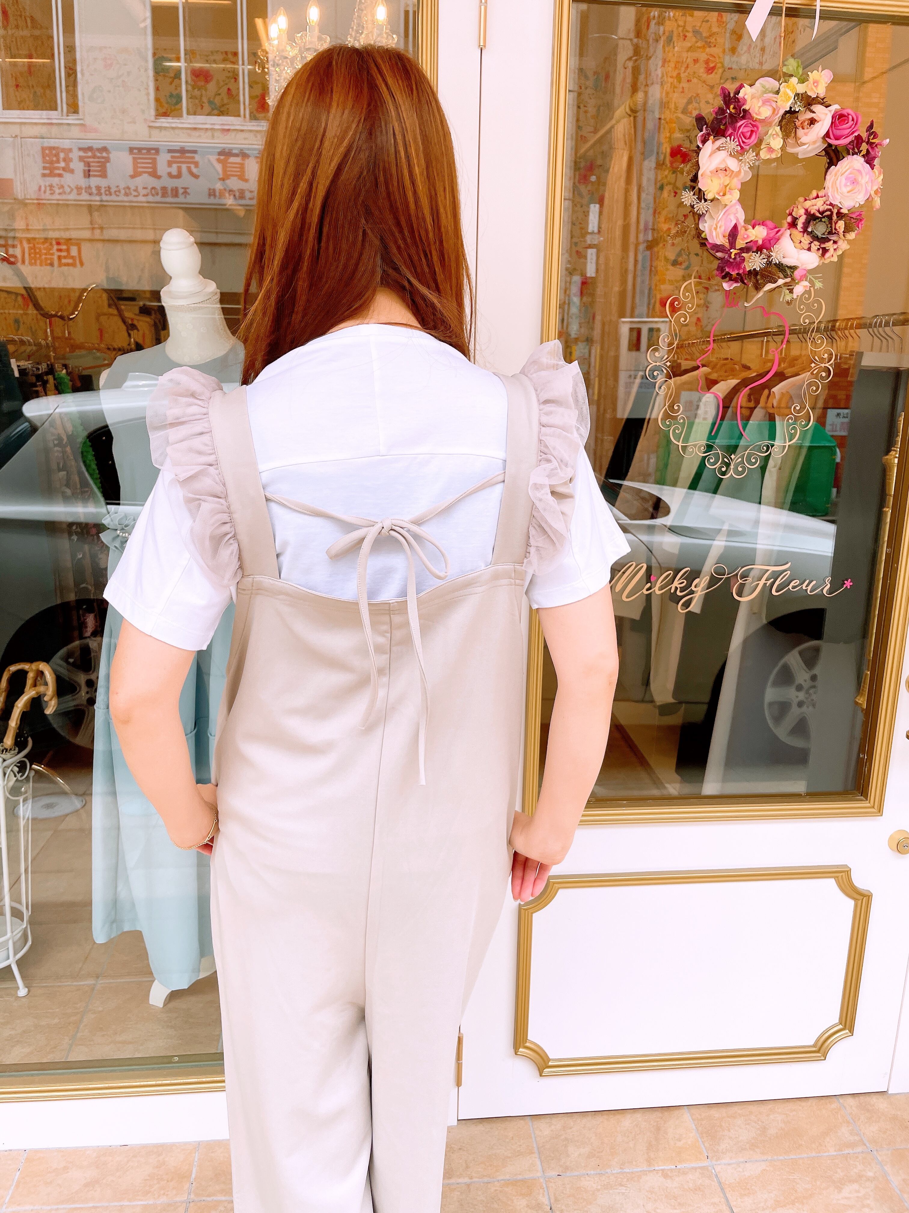 肩部分にチュールフリルが付いたサロペットは、ゆったりしたシルエット&サイズ感で動きやすく、バックスタイルのリボンもアクセントに。