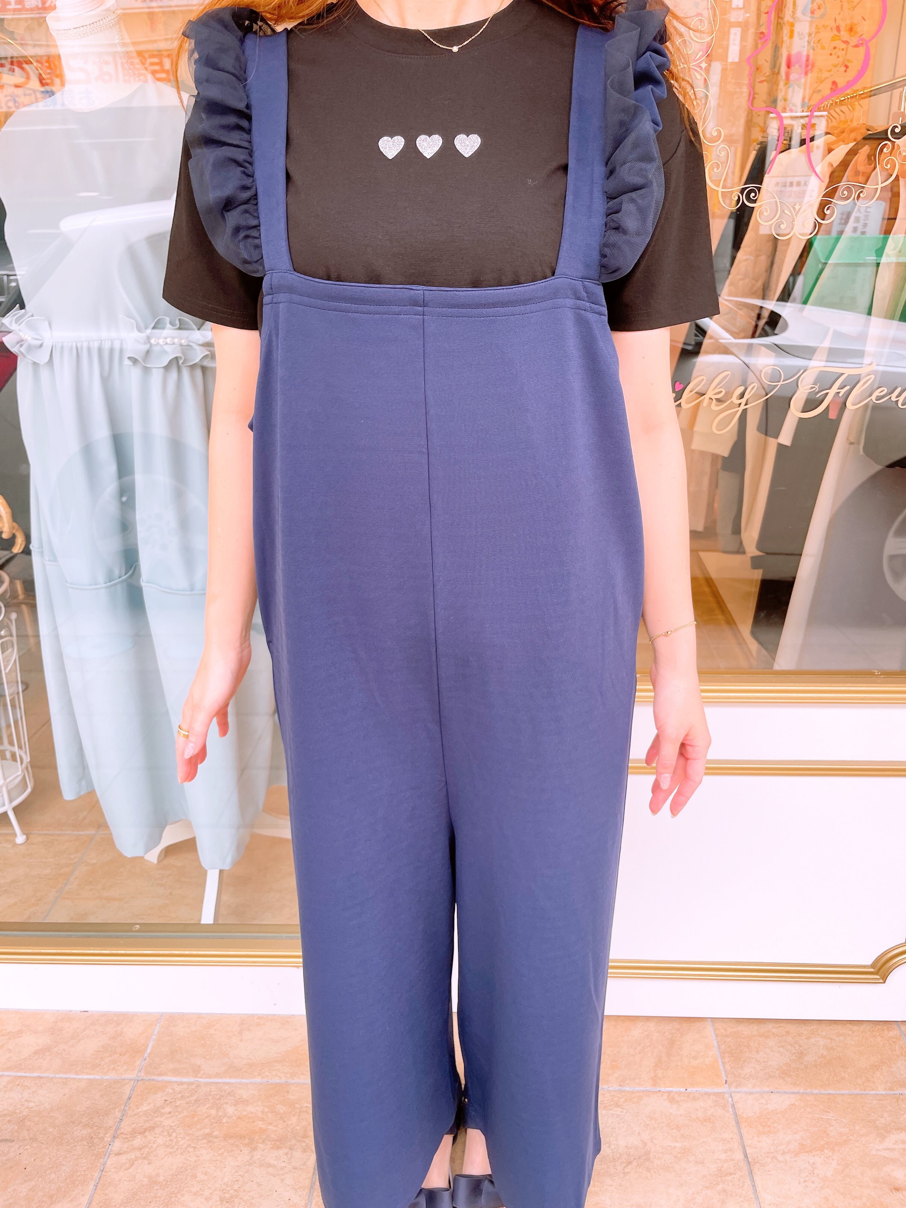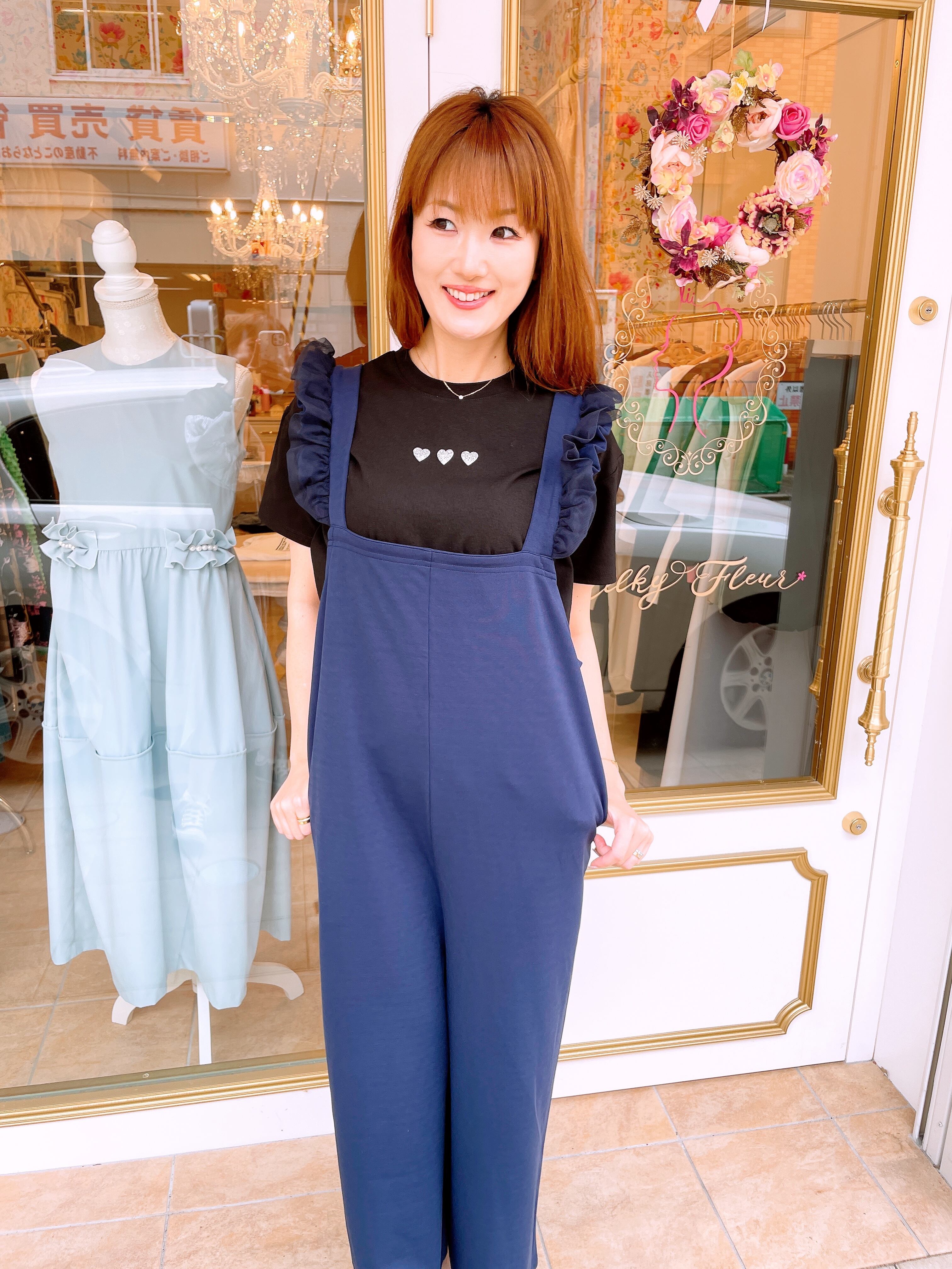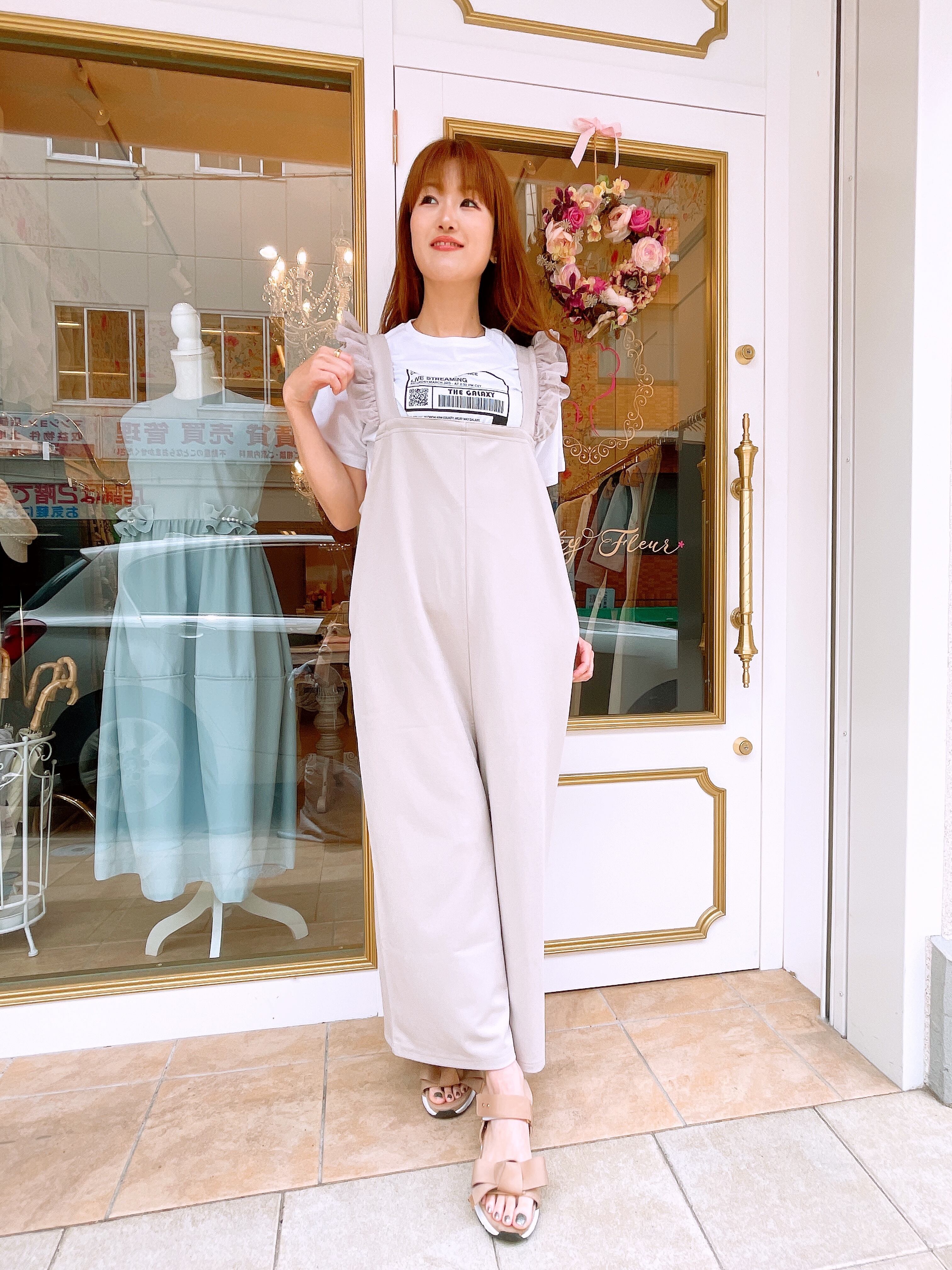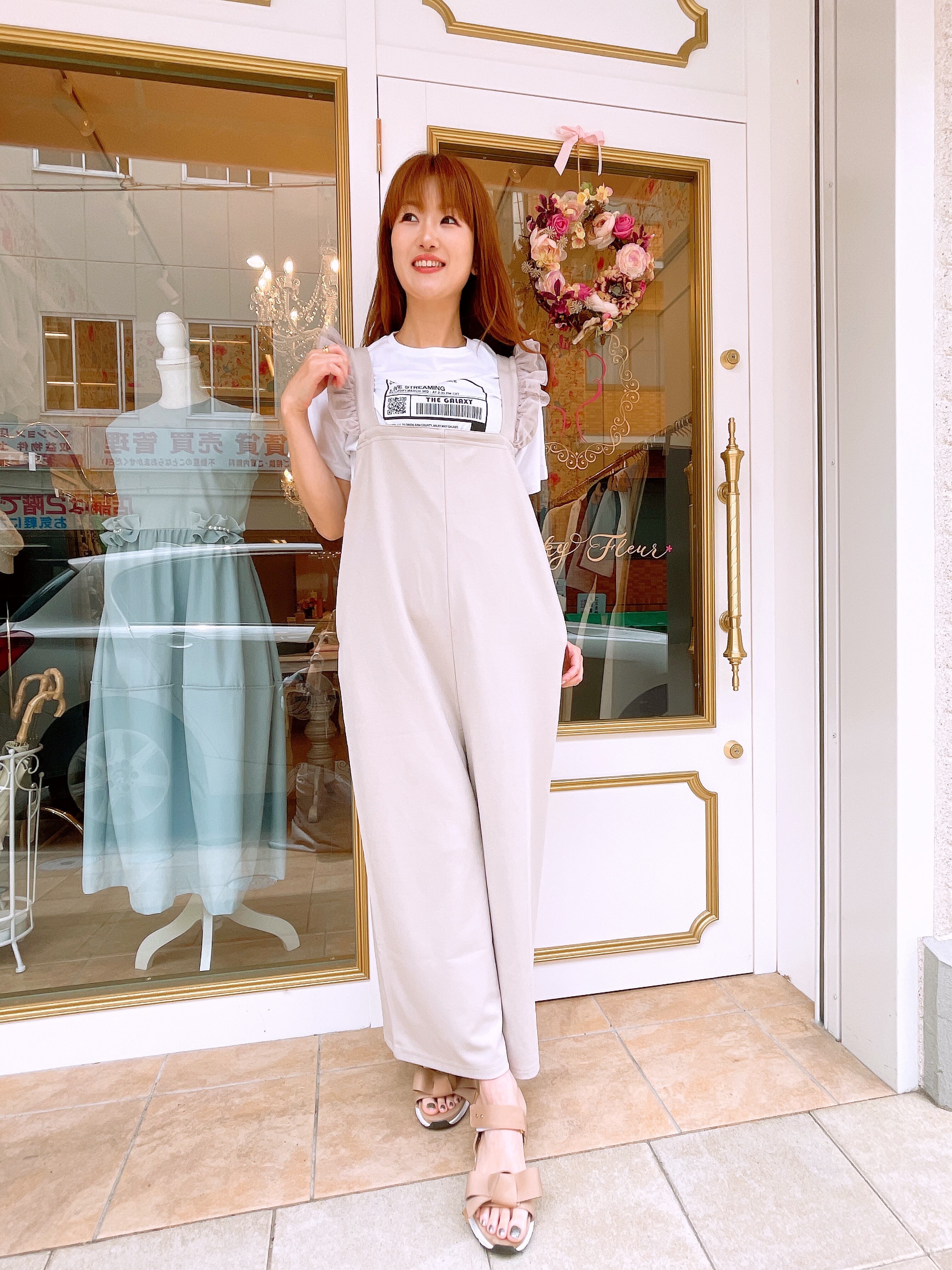 肩部分にチュールフリルが付いたサロペットは、ゆったりしたシルエット&サイズ感で動きやすく、バックスタイルのリボンもアクセントに。