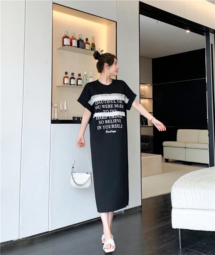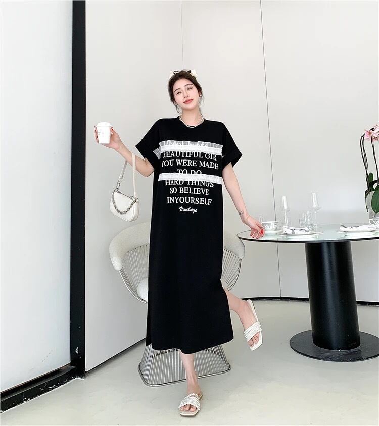 レタープリントにフリルがアクセントのTシャツワンピース。