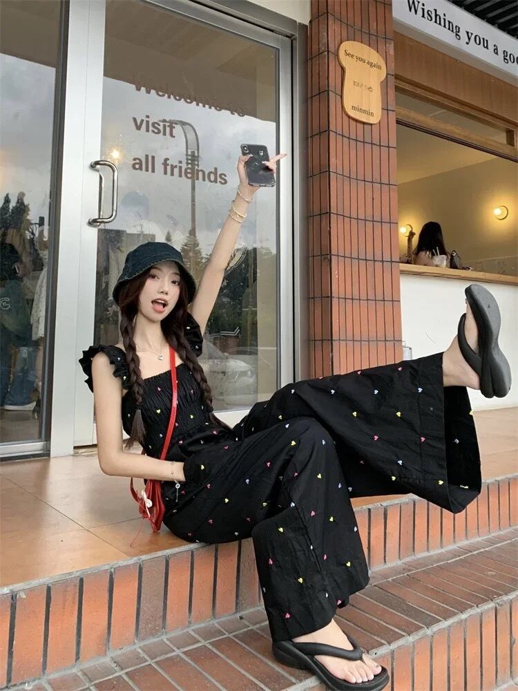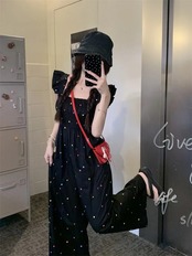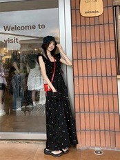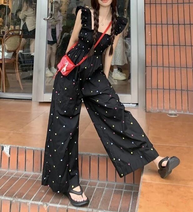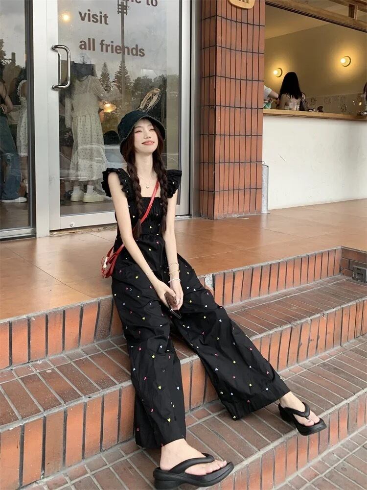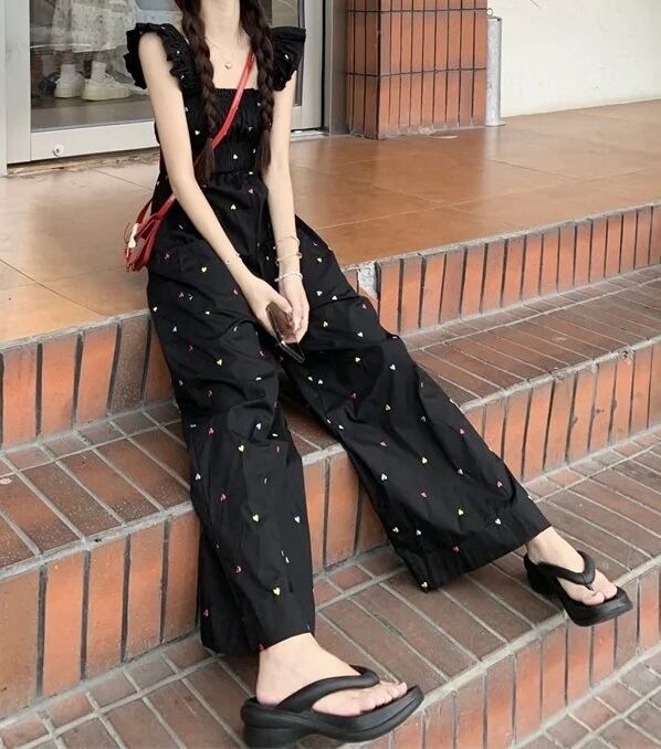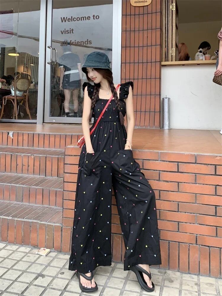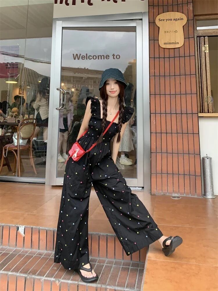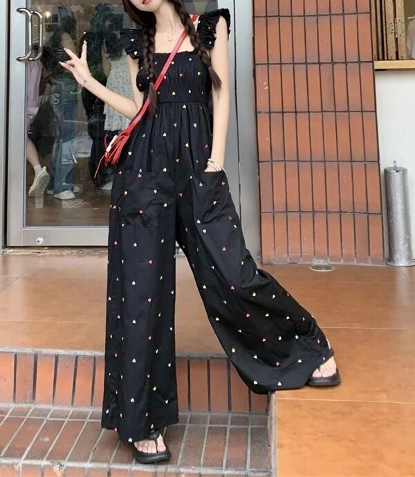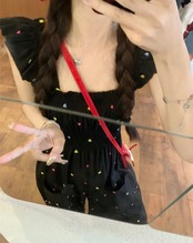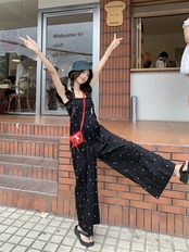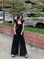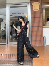 ショルダーフリルやシャーリングもアクセントになり、動きやすく旅先などにもオススメなサロペットです。