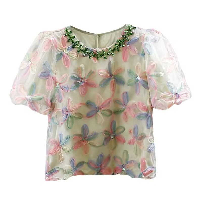 マルチカラーのフラワーにビジューネックが華やかなトップス。
